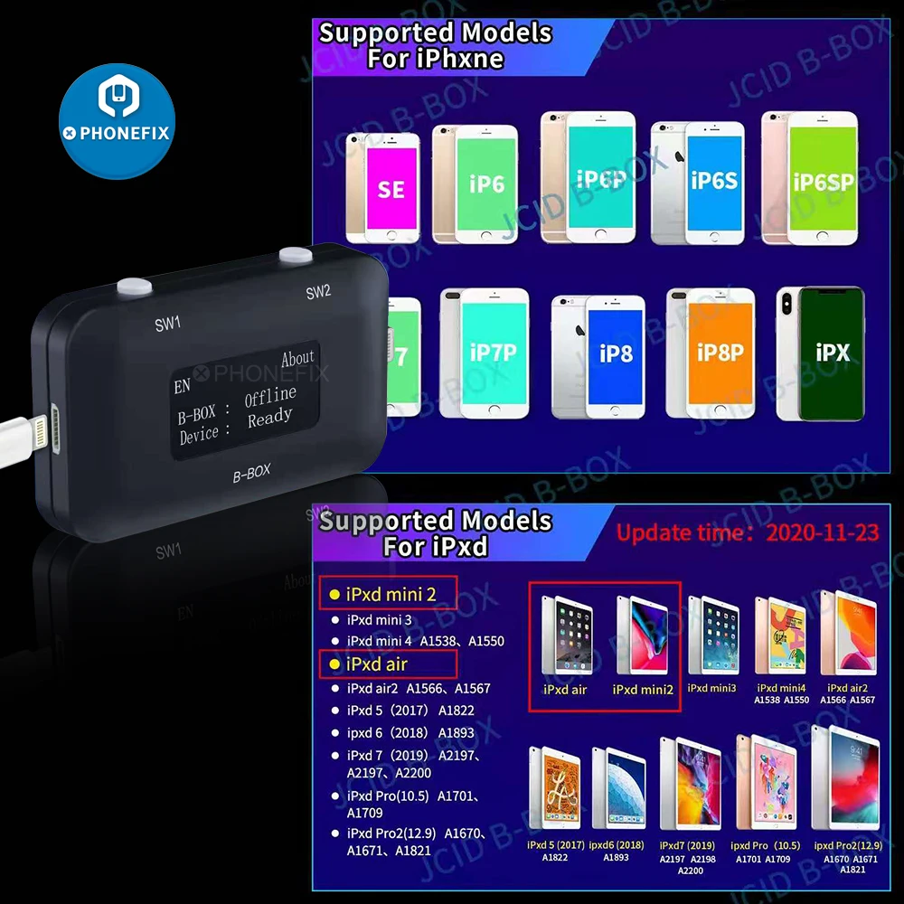 1. B-BOX поддерживает большинство полных моделей для всех устройств iO * S от A7-A11, поддерживает ipxne SE-X, iPxd mini 4, ipxd 5 / 6, ipxd Pro (10,5), ipxd PRO2 (12,9) в настоящее время, больше моделей для поддержки через бесплатное обновление в будущем.