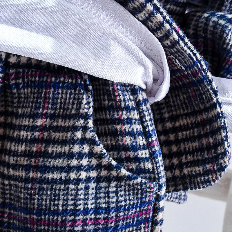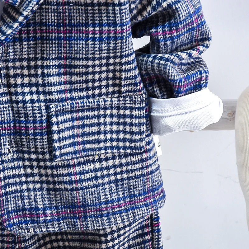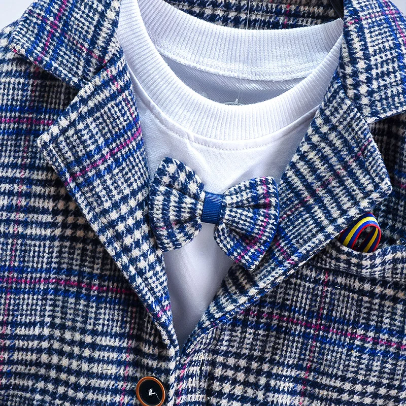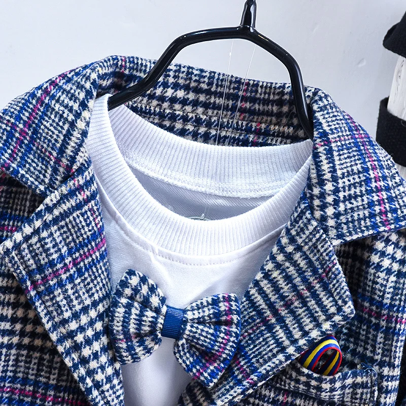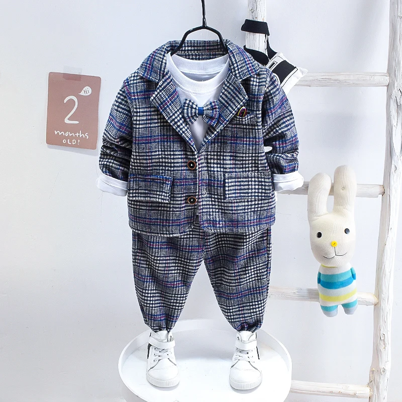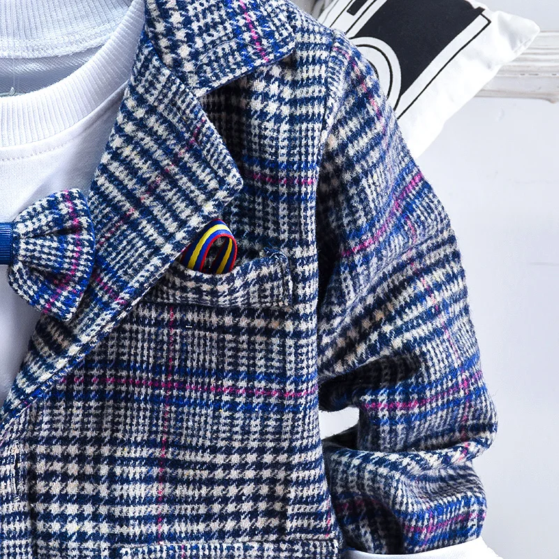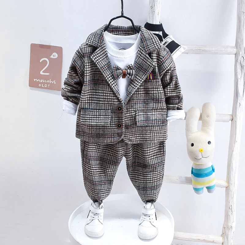 Одежда для маленьких мальчиков осенне-зимний костюм, наряд официальная детская От 1 до 6 лет шерстяное клетчатое пальто для мальчиков, штаны футболка галстук-бабочка, комплект из 3 предметов