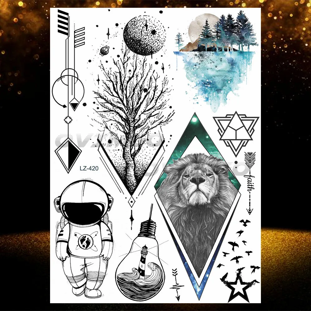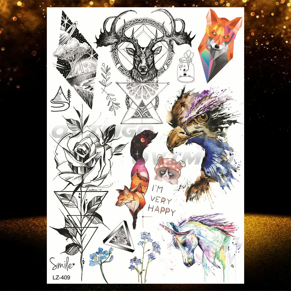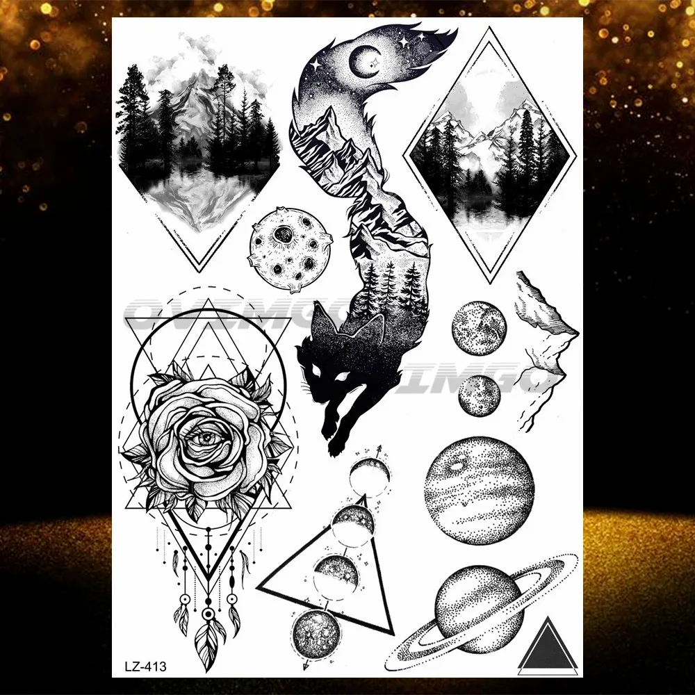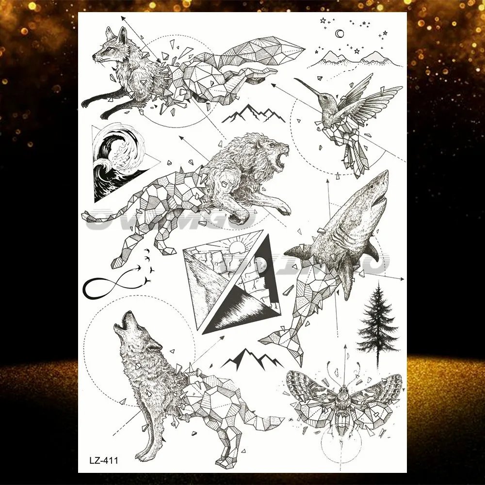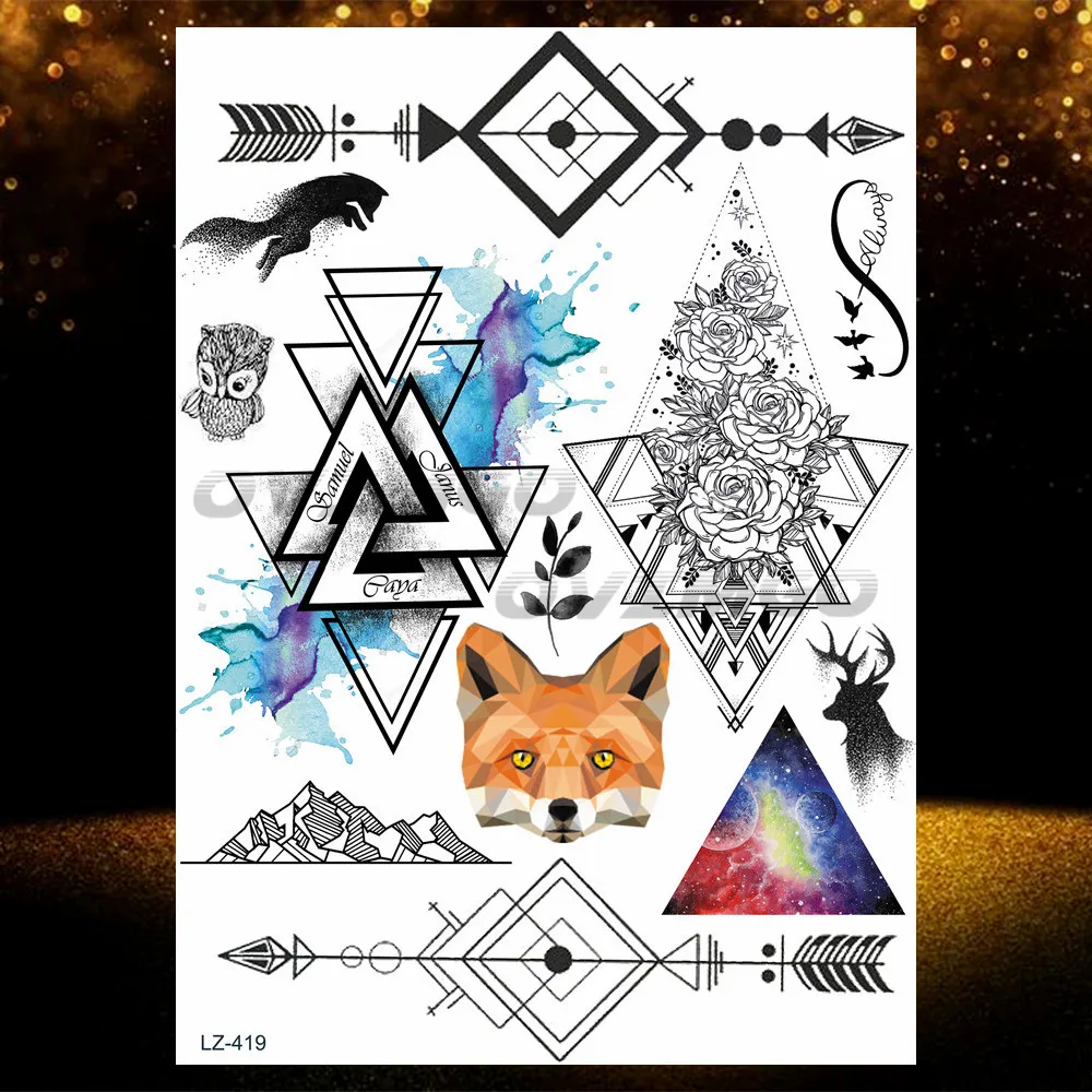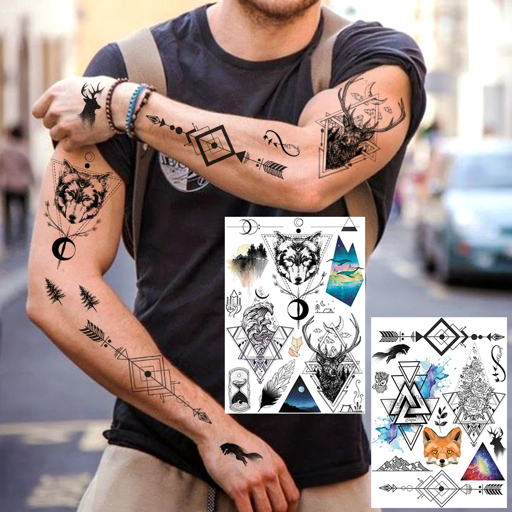 Волк, треугольник, лиса, временные татуировки для детей, мужчин, искусственный лось, цветок, татуировка, тело, руки, гора, перо, Геометрическая волна
