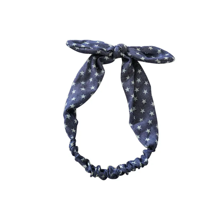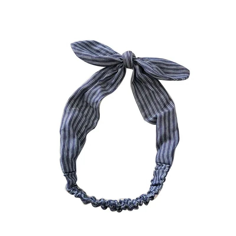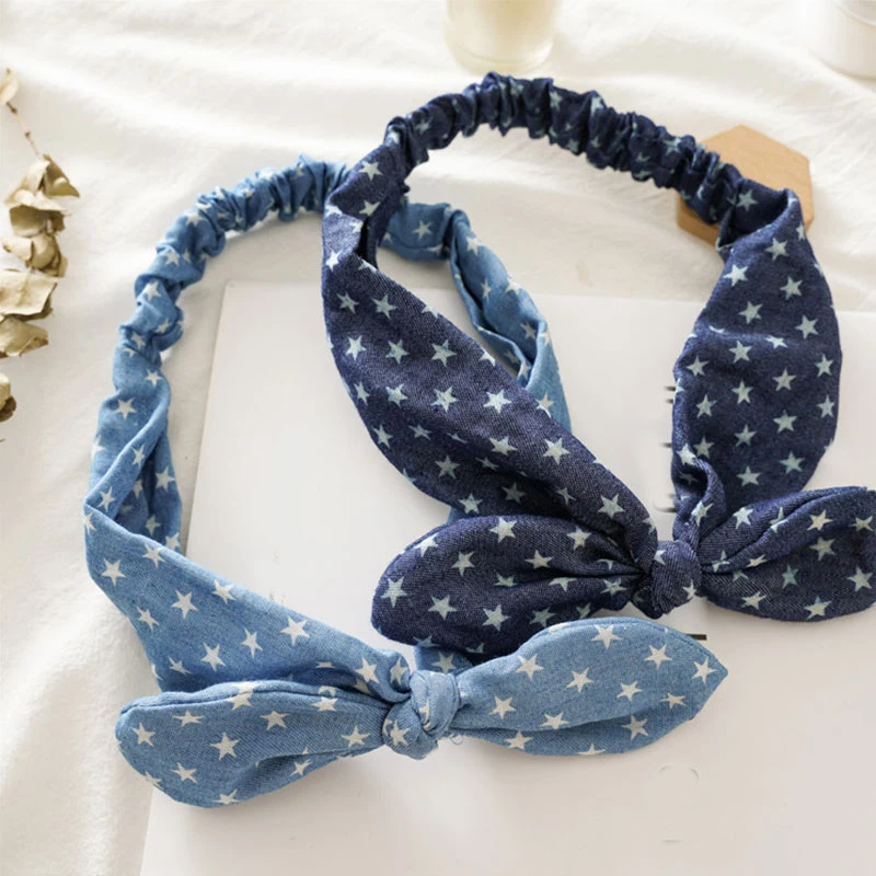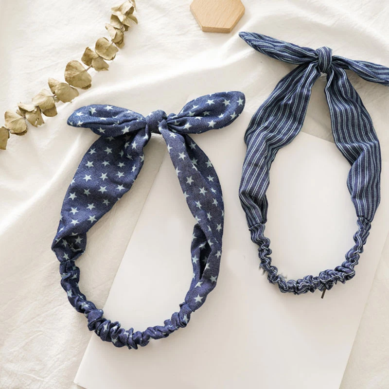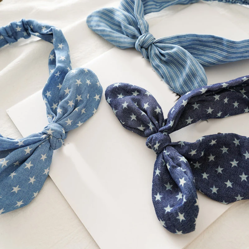 Повязка для волос с бантом Женская, ободок с кроличьими ушами эластичная лента из денима, в полоску, со звездами, летний аксессуар