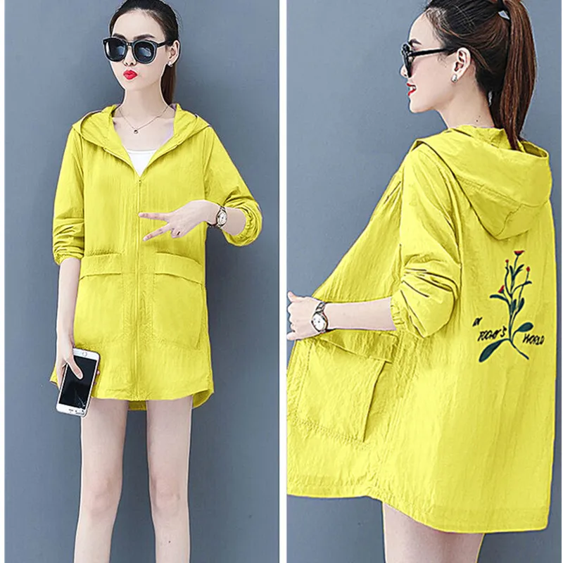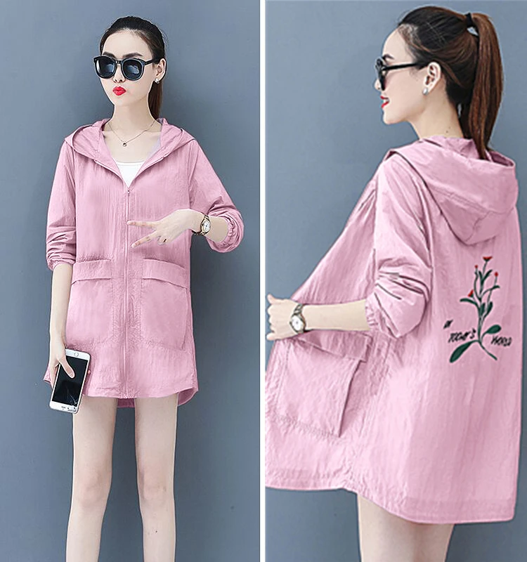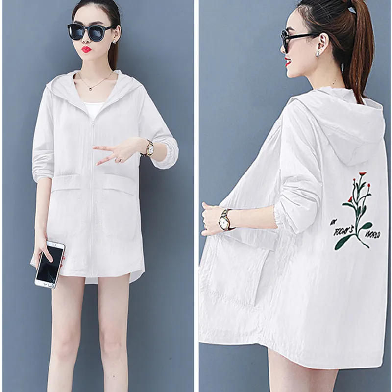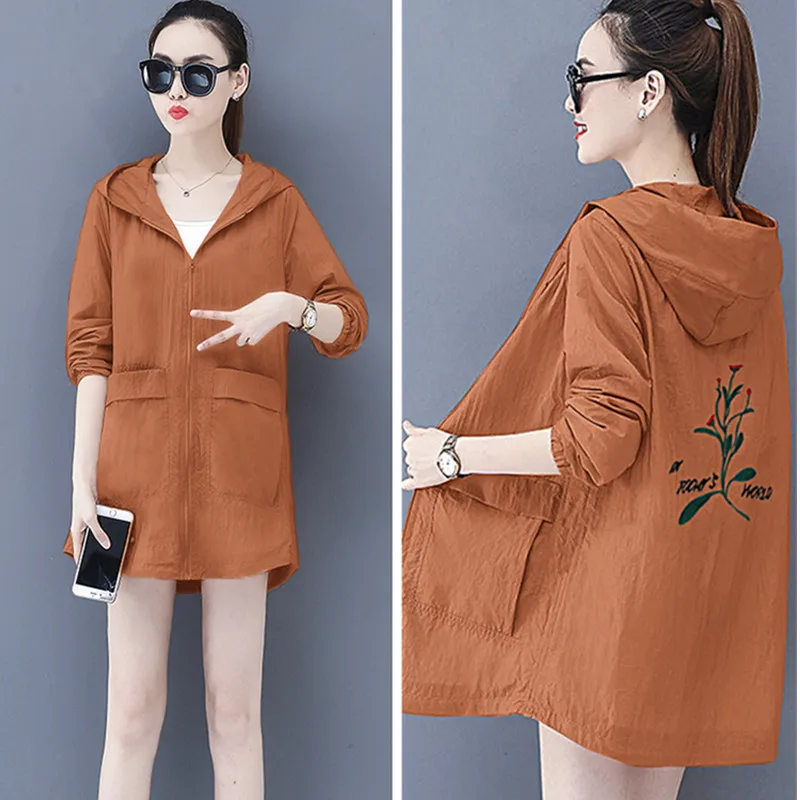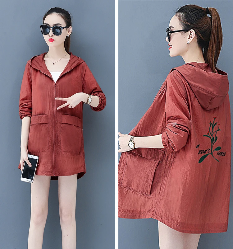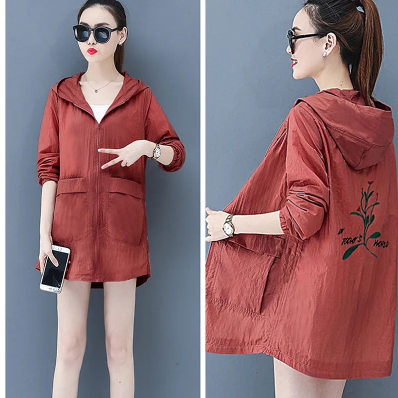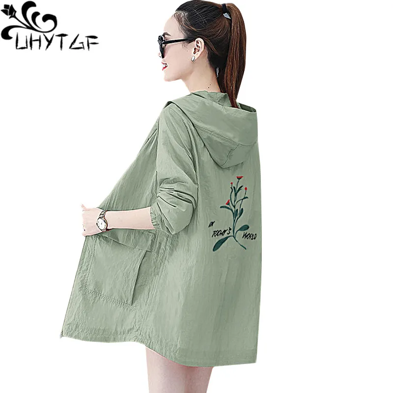 UHYTGF корейский Свободный 6XL БОЛЬШОЙ РАЗМЕР Солнцезащитная одежда модная вышивка с капюшоном пальто дышащая Повседневная тонкая верхняя одежда для женщин 1164 на лето
