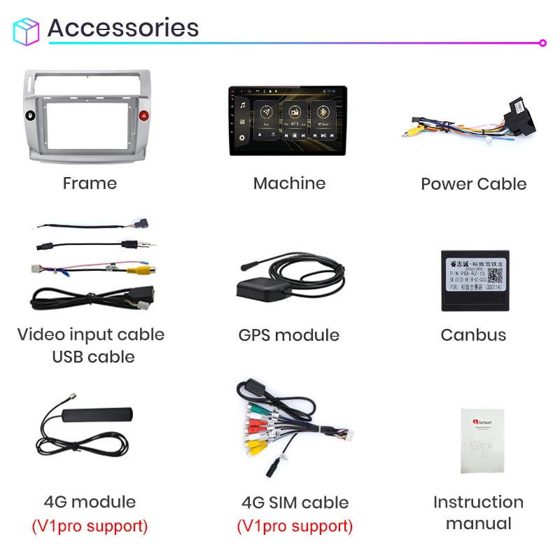 1. Штифт-штифт: Кабель питания Junsun radio' является штифтом для штифта, прост в установке;2. Встроенный Carplay/ Android Auto: Поддержка версии V1Pro, просто используйте кабель телефона, подключите его, стабильный и простой в использовании; (V1 поддерживает только Android Auto, но нужно покупать; V1C не поддерживает)3. Поддержка подголовника: только поддержка версии Junsun V1;