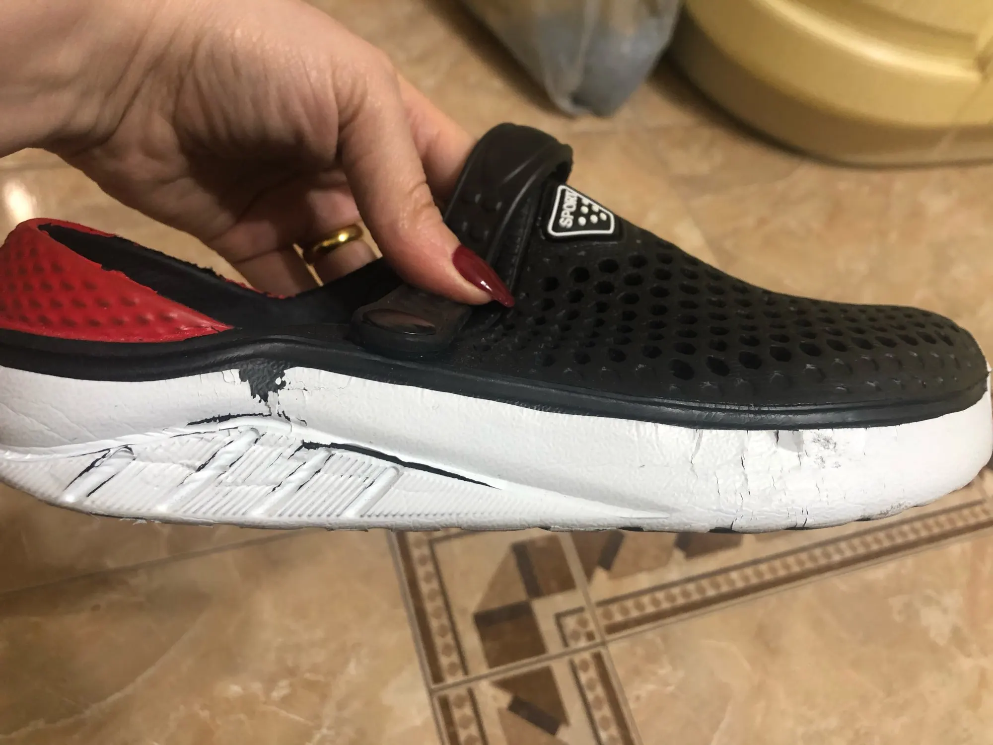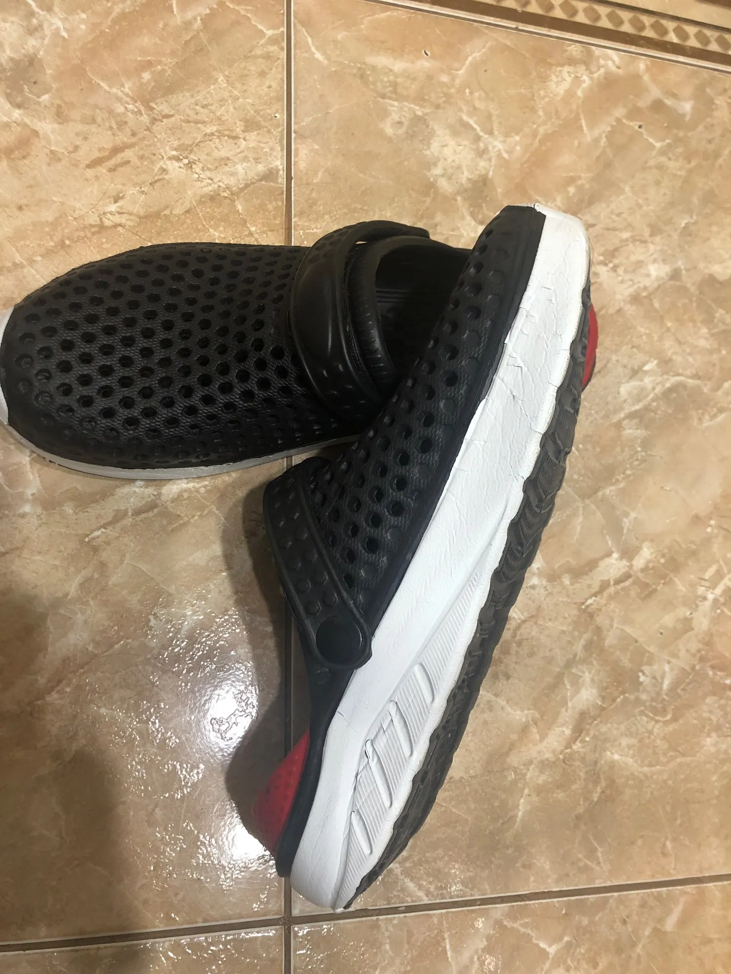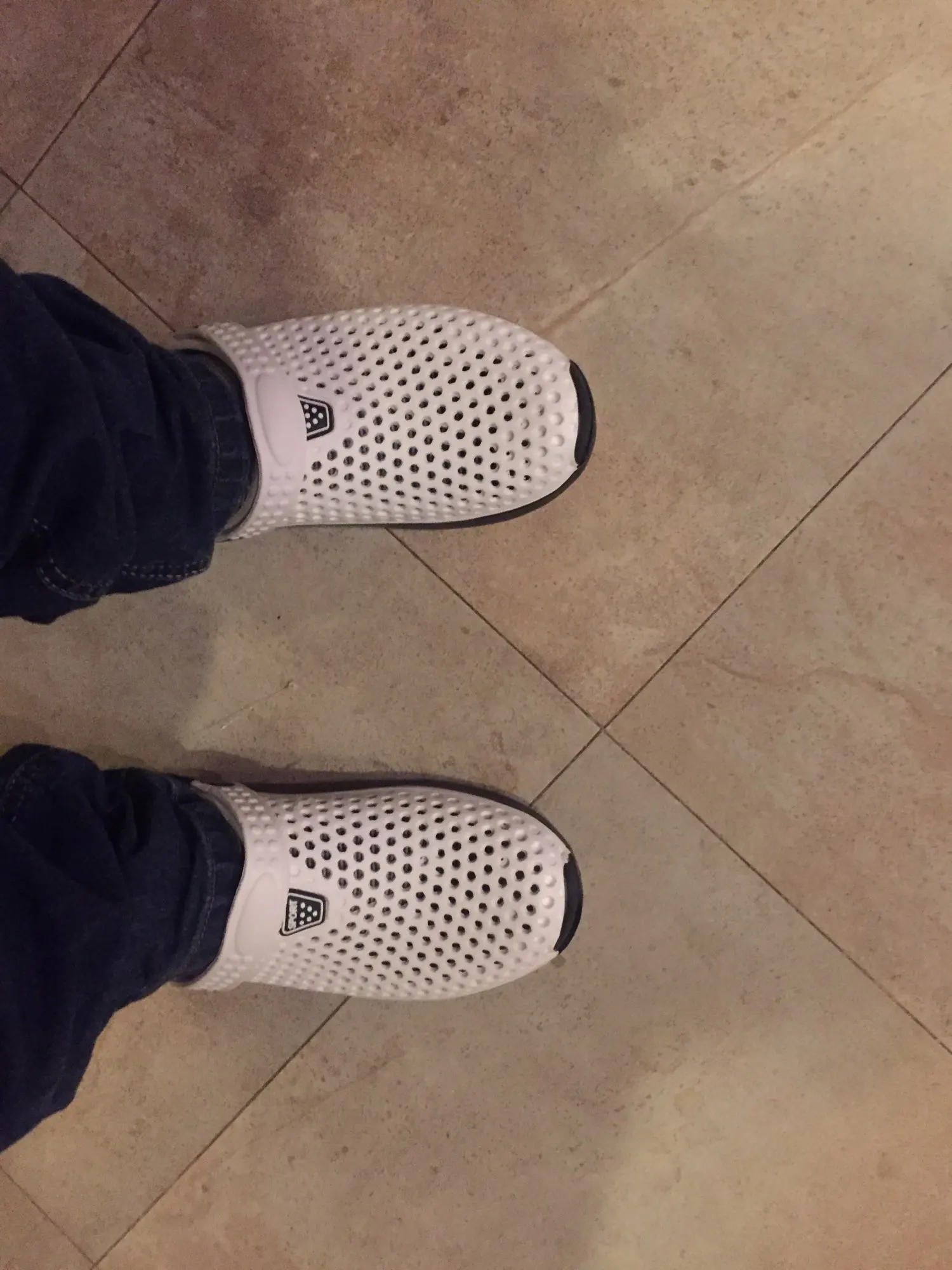 Сначала о заказе, доставка за 2 недели от момента оплаты до получения в постомате в 150 метрах от дома. Теперь о тапках: они маломерят, и очень сильно. Пришедший 43 размер имеет небольшой запас на ногу нашего 40 размера. Тапки цельнолитые из серой массы, белое и жёлтое это краска. Запах фенола при вынимании из пакета просто сшибает, положили в туалет, выветриваться. И не смотря на это, за такие деньги - маст хэв. Рекомендую товар и продавца, good seller, I recommend!