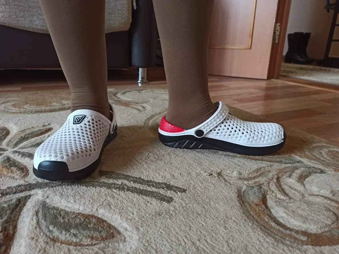 Описание полностью соответствует. Мягкие и легкие. Размерная сетка: на длину стопы 24 см взяла 39 й. На фото видно, что чуть чуть большеваты. На длину стопы 29 см взяли 45 й размер. На фото видно, что чуть чуть свободны. Но мы так и хотели. Спасибо огромное.