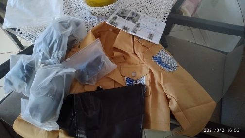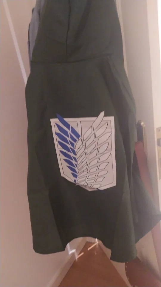 Это хороший продукт-немного трудно надеть, но это хорошие обучающие материалы. Все, что на картинке (на указанном товаре) включено, и это достойное качество по цене. Я думаю, что в списке он сказал, что это один размер, но на маленькой юбке думаю, что это L (европейский). Это сделает отличную работу для косплея Титанов.