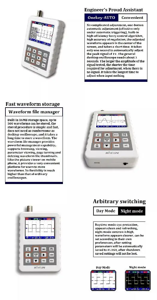 Характеристика:Диапазон высокого измерения напряжения, 1X может измерить 0 ~ 40 В, 10X может измерить 40 ~ 800 в:;До 11 параметров измерения: VPP,Vmax,Vmin,Vavg,Vrms, частые, Duty +,Duty-,Time +,Time-,TimeВ любое время дисплей формы волны (Функция паузы) замороженОснащен высокой эффективностью одной кнопкой автоПолная функция запуска (одиночный, нормальный, автоматический)Встроенный перезаряжаемый литиевый аккумулятор емкостью 1200 мАч может непрерывно заряжаться в течение 3 часов одновременноДневной режим и ночной режимМалый объем, легко носить с собой