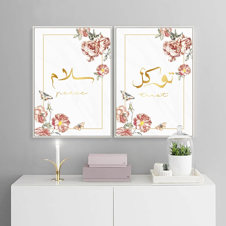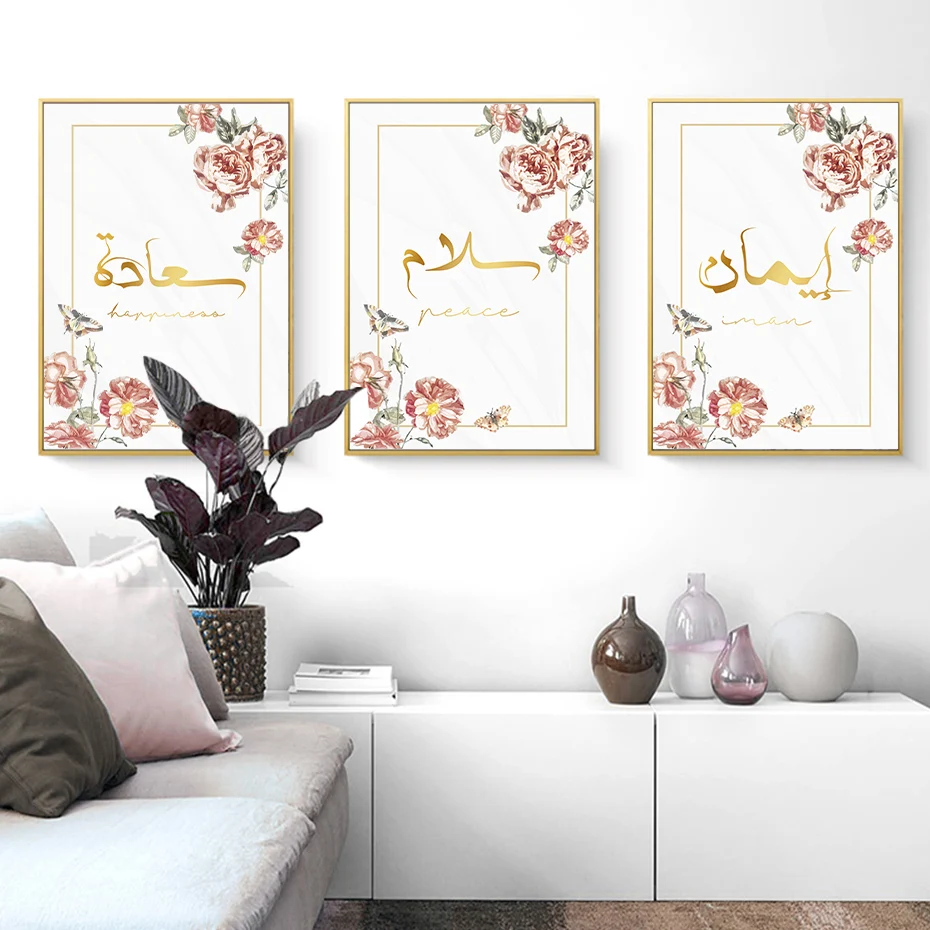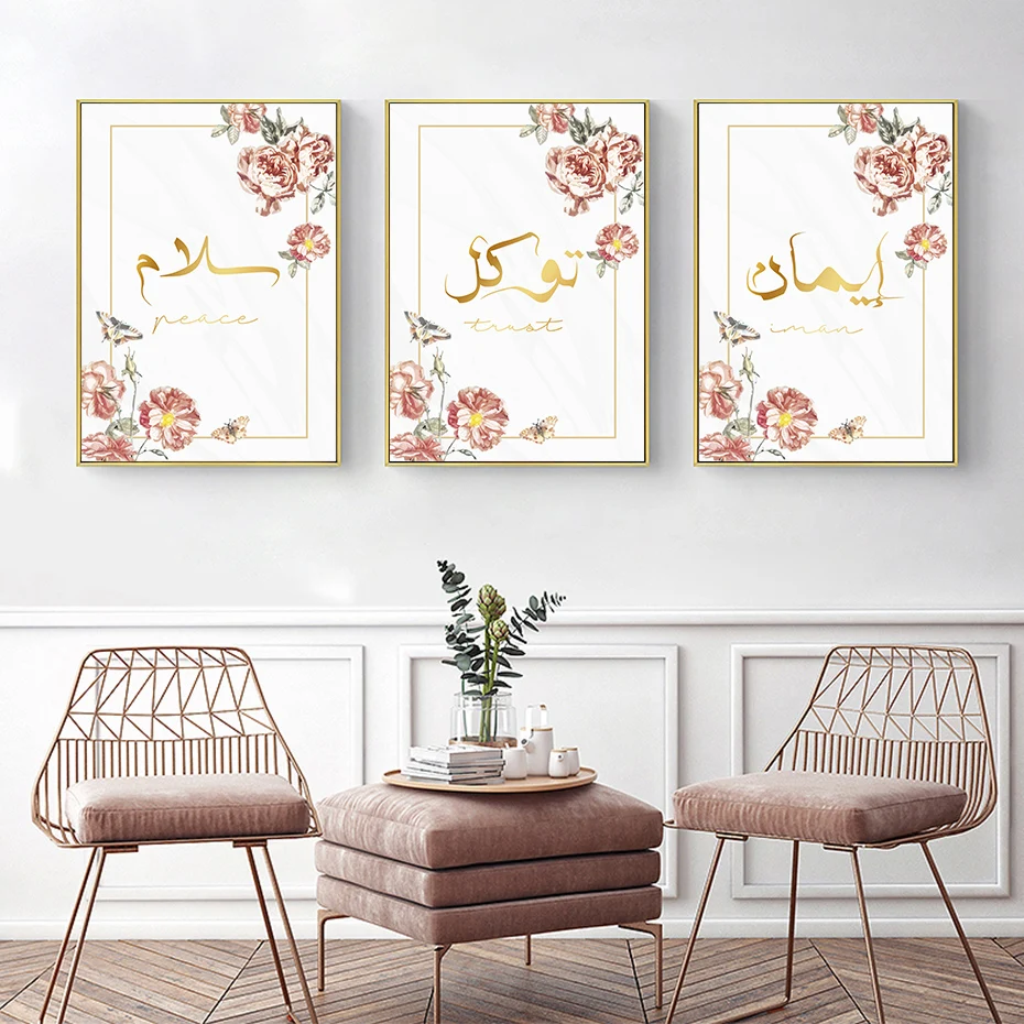 Исламский мусульманский Золотой арабский каллиграфия цитаты Пион цветок холст живопись настенные художественные принты постер Картина гостиная домашний декор