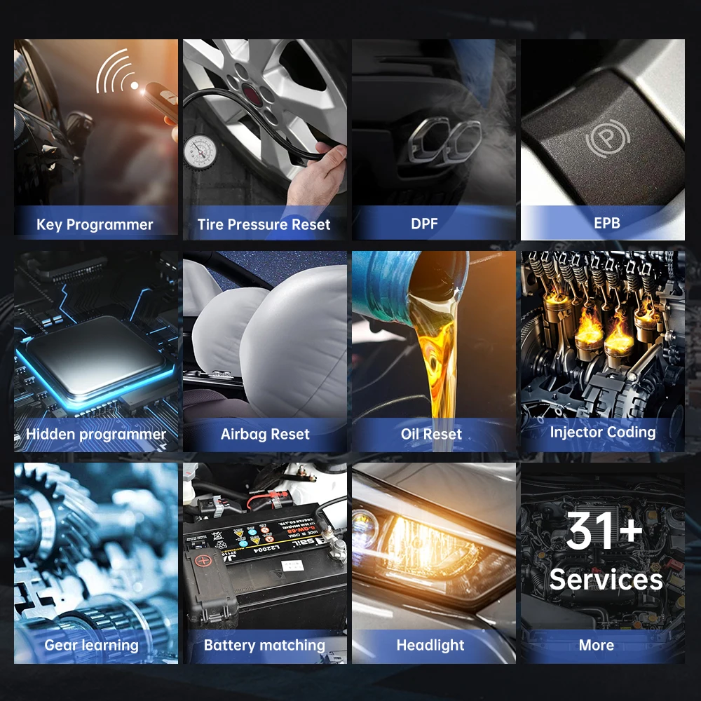 Кодирование ECU-функция кодирования используется для повторной вспышки модулей управления транспортным средством, это позволяет перепрограммировать адаптивные данные для некоторых компонентов после ремонта или замены.Сброс масла-Сброс системы жизнедеятельности масла каждый раз, когда масло и масляный фильтр изменяются;Кодирование инжектора-новые номера инжектора для замены предыдущего при установке новых инжекторов или после завершения замены;Сброс тормоза-деактивировать и активировать тормозную систему управления, помочь с контролем тормозной жидкости, открыть и закрыть тормозные колодки и т. Д.;SAS RESET-выполнение калибровки датчика угла поворота и четких записей;Аккумулятор. Сброс-оценка состояния заряда аккумулятора, мониторинг замкнутого тока, регистрация замены аккумулятора и т. Д.;ABS кровотечение-когда ABS содержит воздух, функция кровотечения ABS должна быть выполнена для кровотечения тормозной системы для восстановления чувствительности тормозов ABS;ELEC. Дроссельная заслонка RLRN-Инициализация приводов дроссельной заслонки так, чтобы «выученные» значения, хранящиеся на ECU, возвращались в состояние по умолчанию;Сброс TPMS-сброс давления в шинах должен быть выполнен после выполнения технического обслуживания;Ключевой программист: Помогите ECU распознать новые ключи, когда вам нужно добавить новые ключи.DPF REG - Clear PM (твердые частицы) от фильтра DPF через непрерывный режим окисления сгорания для стабилизации производительности фильтра;GEAR LEARN-выполнение передач обучения для автомобиля, когда двигатель ECU, Датчик положения коленчатого вала или маховик коленчатого вала заменен..............