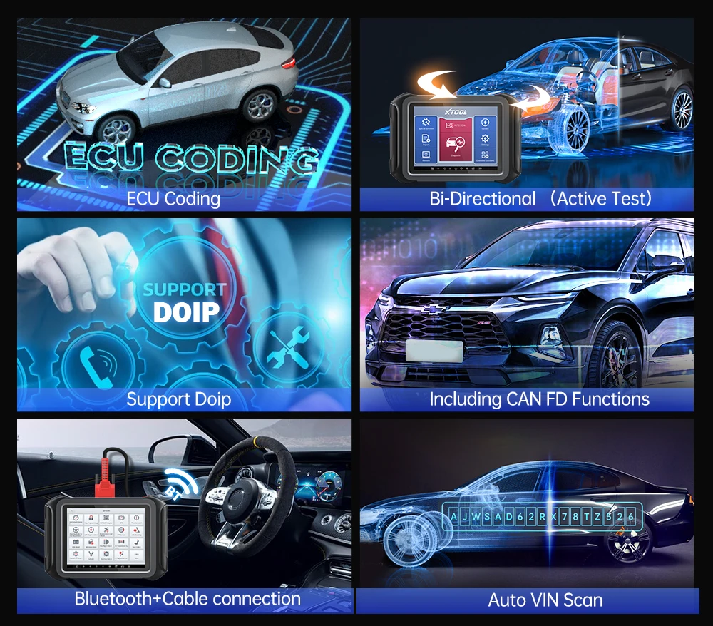 1. Кодирование ECUПотому что каждый автомобильный привод имеет код записи в ECU, который является основой для автомобильного компьютера для привлечения их работы. XTOOL D99 оснащен усовершенствованной функцией кодирования ECU для решения следующих вопросов:После изменения плохих приводов или определенных частей, вам нужно использовать эту функцию, чтобы сделать новый код и распознать новые приводы.Изменяя код с кодированием ECU, легко улучшить производительность транспортного средства или стимулировать высокие функции для автомобиля.Кодирование ECU позволяет нескольким автомобильным системам распознавать друг друга, а затем приводы могут начать работать.Онлайн кодирование ECU доступно для BMW, VW, Porsche, Renault и т. д.Обратите внимание: кодирование ECU изменяет запрограммированные опции, которые зависят от типа и количества уже встроенных электронных функций. Таким образом, кодирование ECU не является универсально совместимым и варьируется для различных транспортных средств.2. Все системы двунаправленный инструмент сканирования-XTOOL D9 (больше, двунаправленный, лучше)С помощью этого диагностического инструмента вы можете отправить команду в ECU для включения/выключения приводов, чтобы легко найти неисправности в подсистемах вашего автомобиля, без использования управления транспортным средством: Включите вентилятор радиатора | Модулировать дроссельную заслонку | Открыть/закрыть окна | Управлять зеркалами | Включить/выключить свет | Включить/выключить звуковой сигнал | Проверить дверной замок... (доступно испытание варьируется изготовителем транспортного средства, год и модель.)3. Поддержка протокола DoIP4. Поддержка протокола CAN FD5.Bluetooth + кабели6. Auto Vin Scan: технология Smart AutoVIN для быстрой и точной идентификации транспортных средств одним касанием для сканирования ECUs, получения информации о транспортном средстве и запуска диагностики на выбранных системах. Быстро получить информацию о вашем автомобиле, сэкономить ваше время.