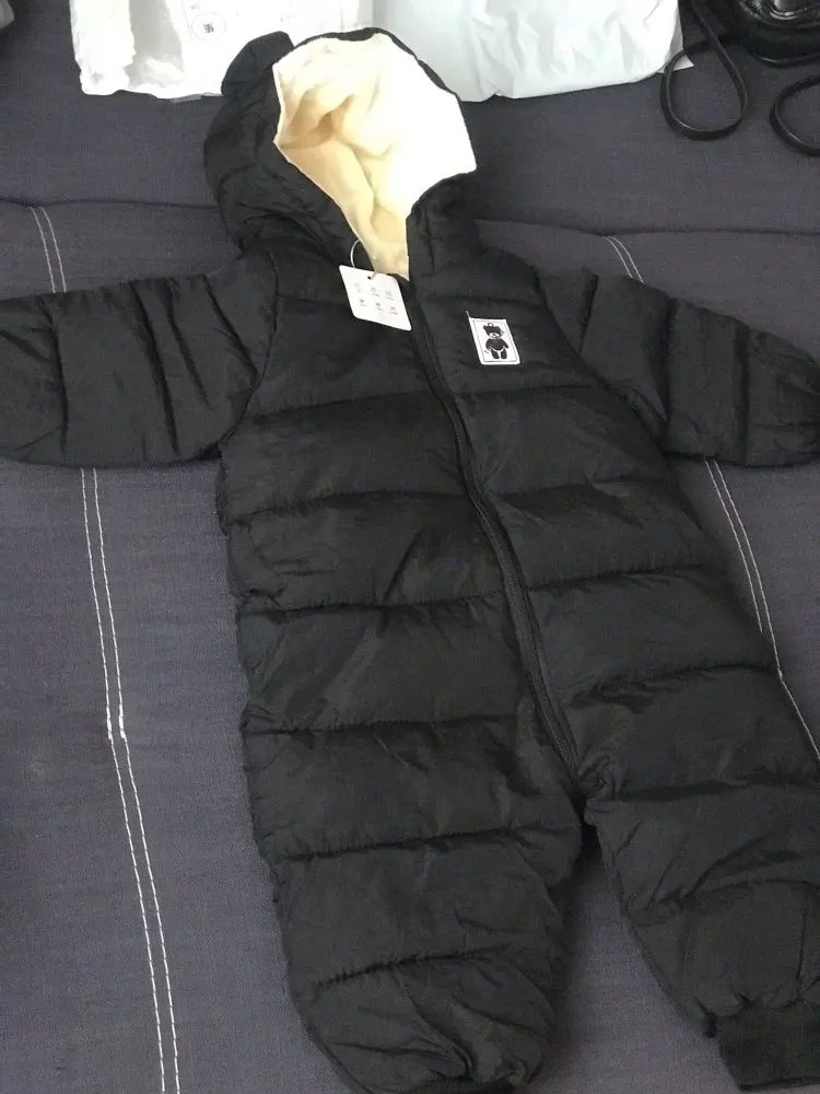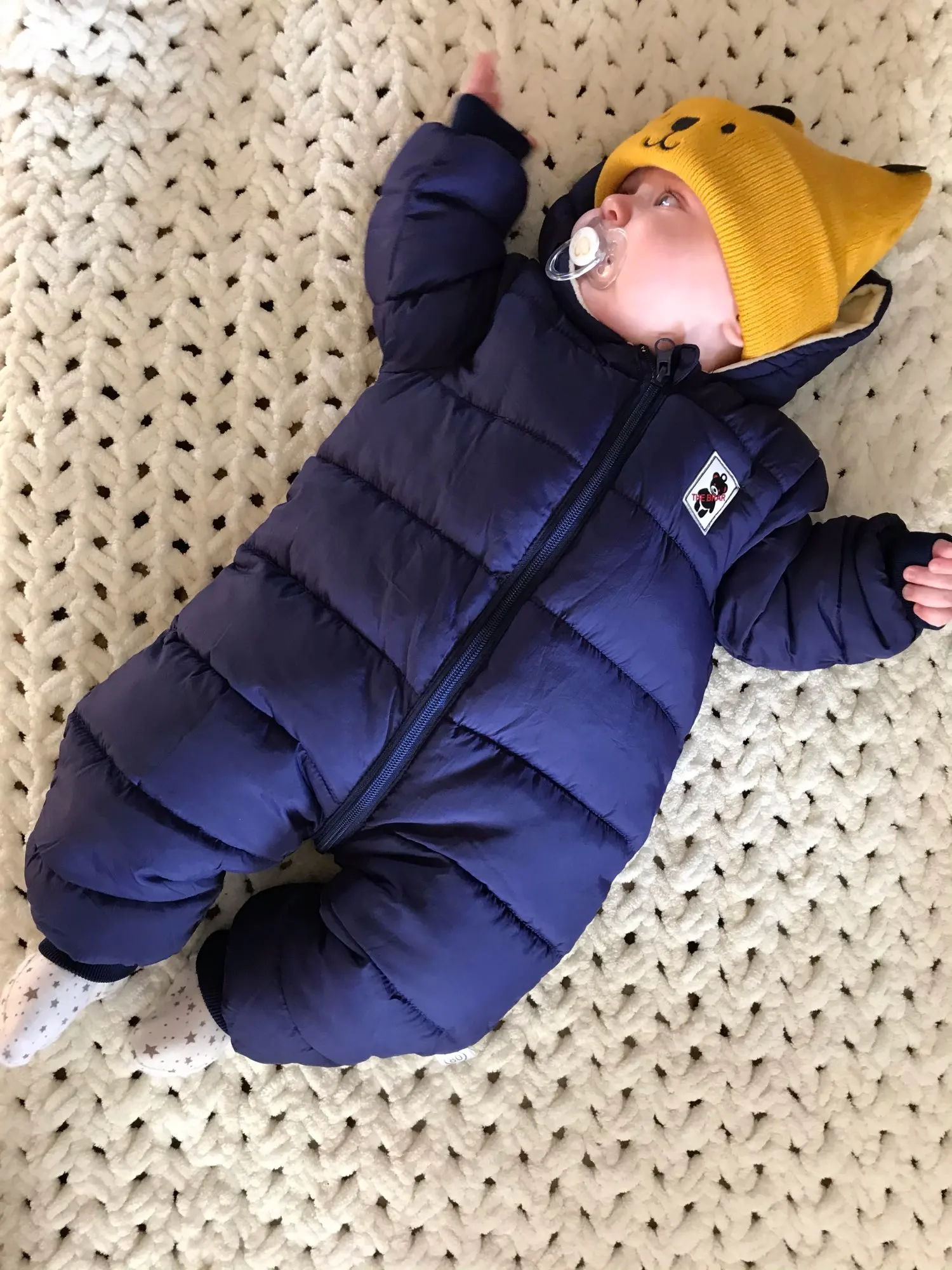 Комбез шикарный, просто топчик! Брала на чёрную пятницу , со скидкой за 12.85 долларов. Моему сыну сейчас 4 месяца , он ещё большой для него но если в коляску можно одеть и сейчас , подкатить рукава и манжеты на ногах. Для сравнения размера добавляю фото с ребёнком . Думаю на весну будет в самый раз. На бирке размер указан 90, я заказывала на 18 месяцев . Тёплый , мягенький всредине, есть прослойка синтепона .