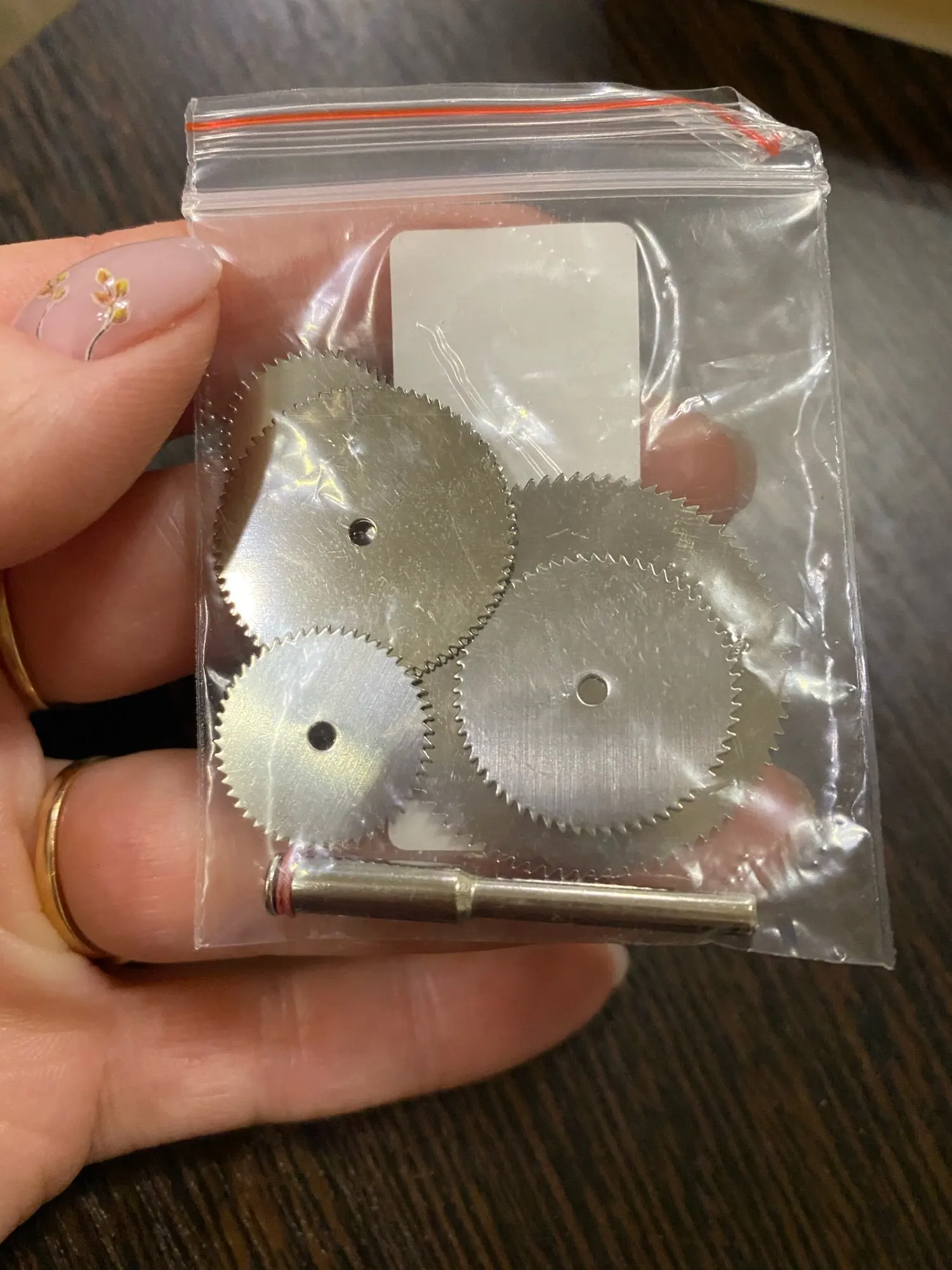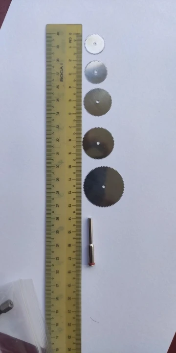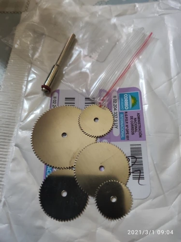 Следует иметь в виду, что в наличии 6 единиц (5 дисков + 1 ручка), которые не выглядят хорошо объясненными продавцом, но все в порядке, сейчас настало время проверить, режет ли он металл, так как материал выглядит очень легким, чтобы быть стальным.