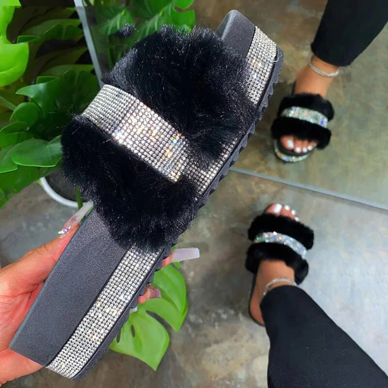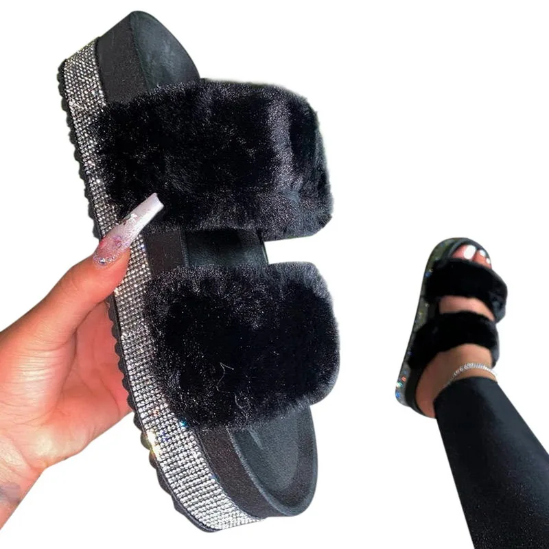 Шлепанцы женские плюшевые на плоской платформе, со стразами, большие размеры
