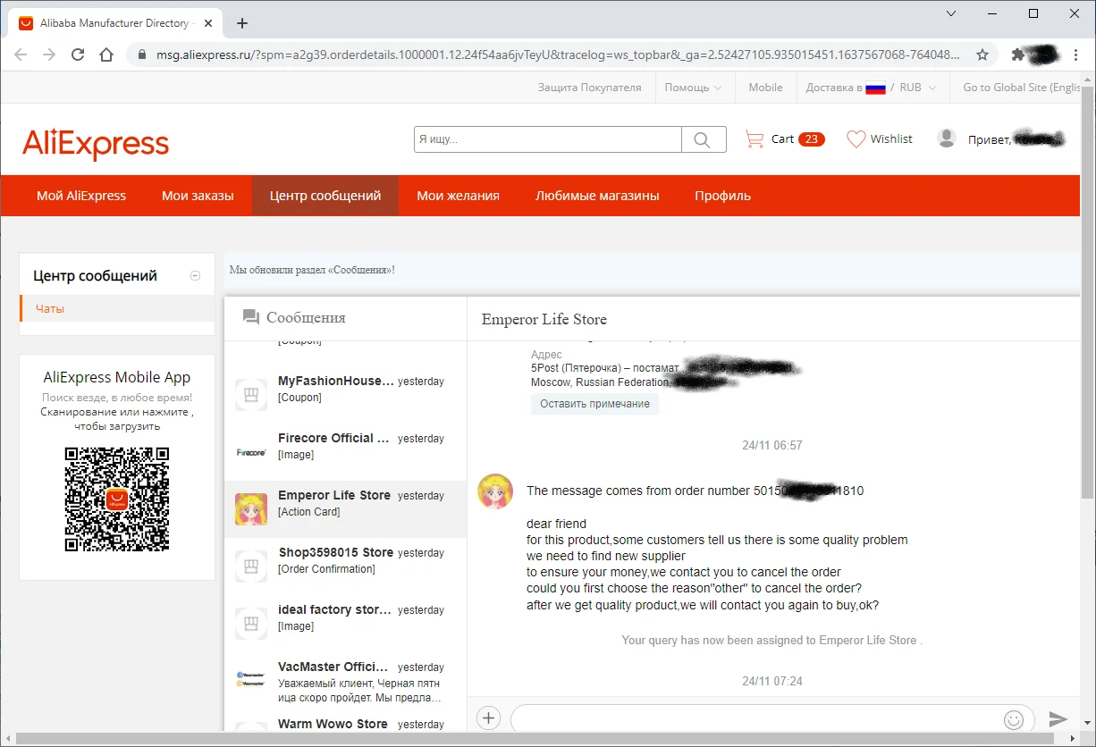 Продавец - мошенник, у него реально товара нет! Почти две недели он не отправлял заказ. Затем он мне предложил отменить заказ, объясняя, что товара нет в наличии (см. скриншот). Но, при этом, он не снял товар с продажи! Я отказался сам отменять заказ. Тогда он как бы отправил заказ и тут же отменил отправку. Заказ был закрыт через техподдержку Алиэкспресс, с полным возмещением.