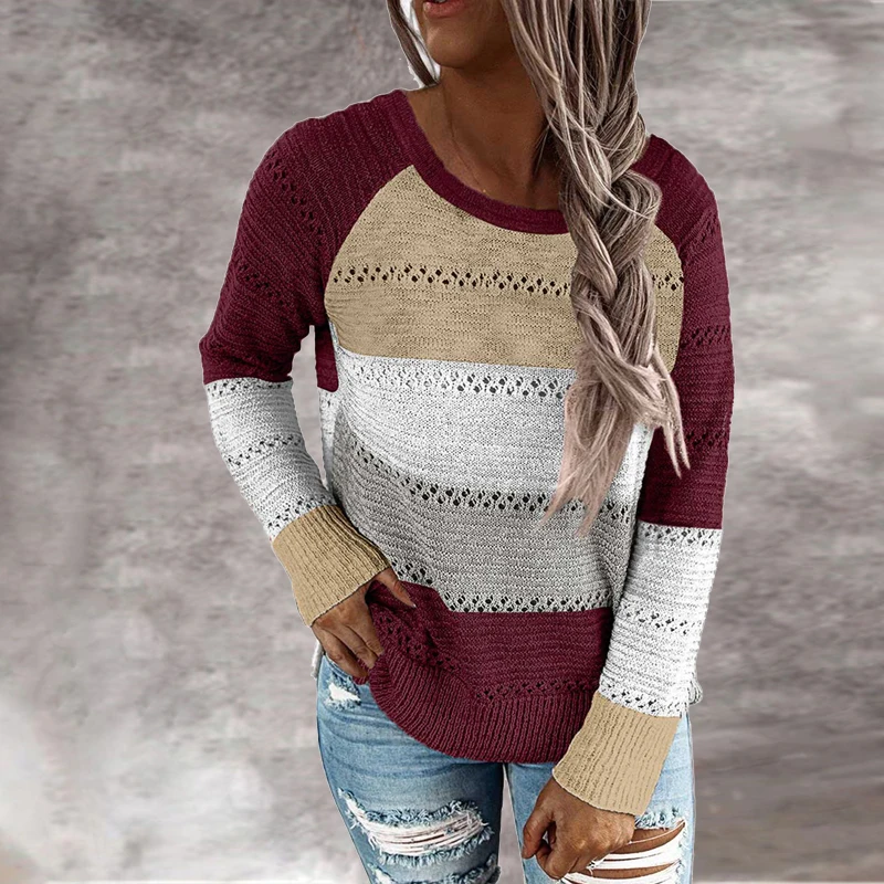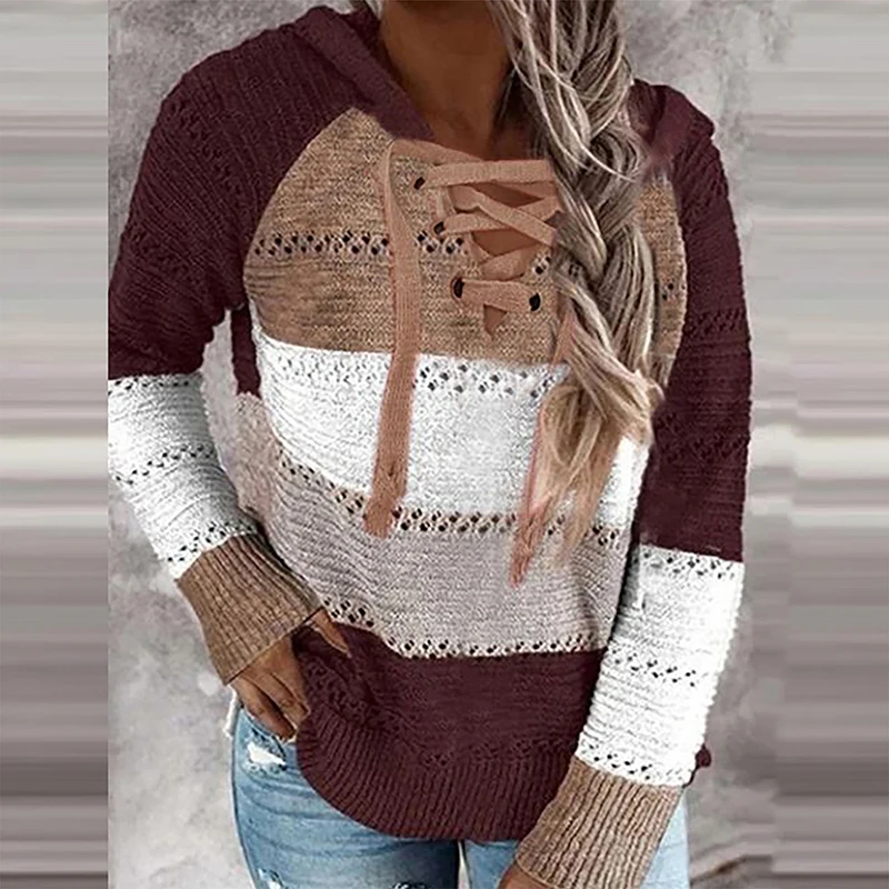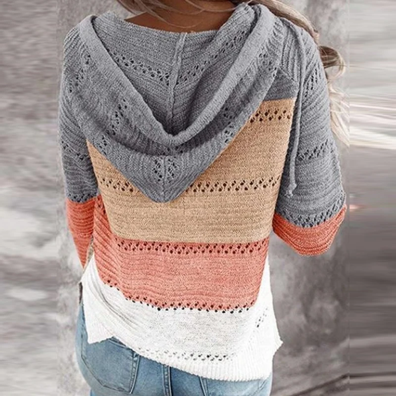Женский Повседневный пуловер с капюшоном, Осенний вязаный свитер с V-образным вырезом и длинным рукавом, Элегантный Полосатый пуловер в стиле пэчворк