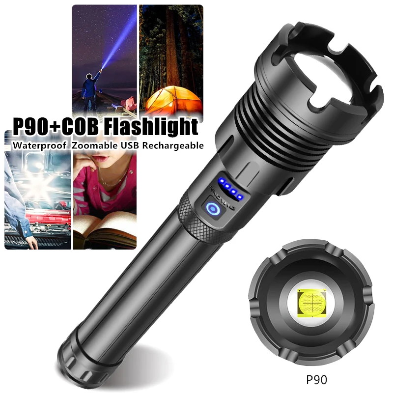 Фонарик XHP90 + COB водонепроницаемый с регулируемым фокусом и зарядкой от USB