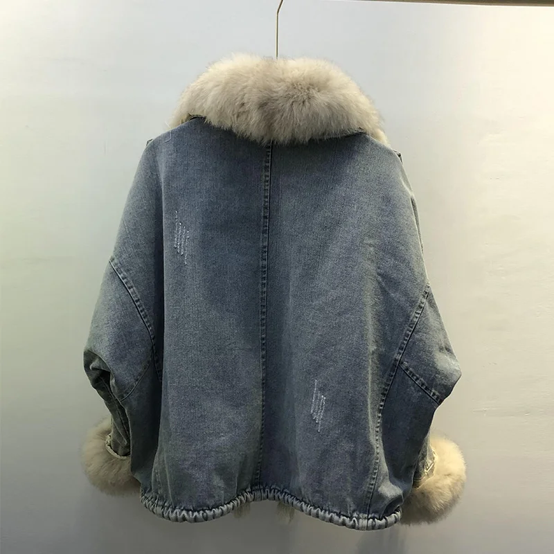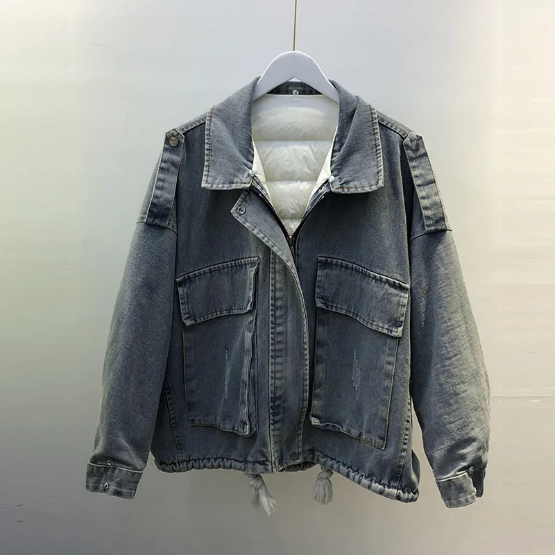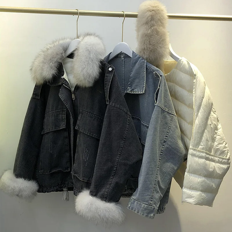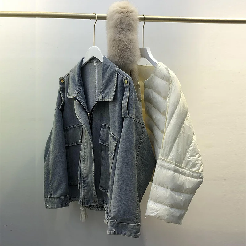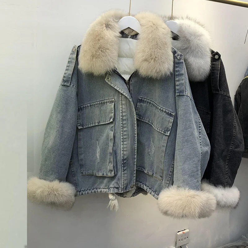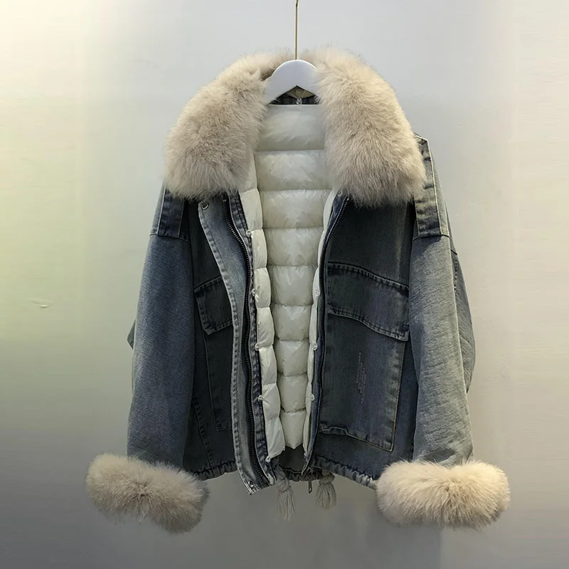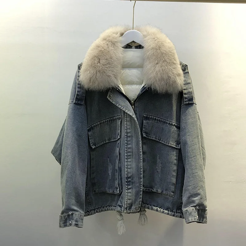 Женский пуховик с воротником из натурального меха лисы, Зимняя Толстая куртка из джинсовой ткани, пуховик на 2021 белом утином пуху, свободная короткая парка, верхняя одежда, 90%