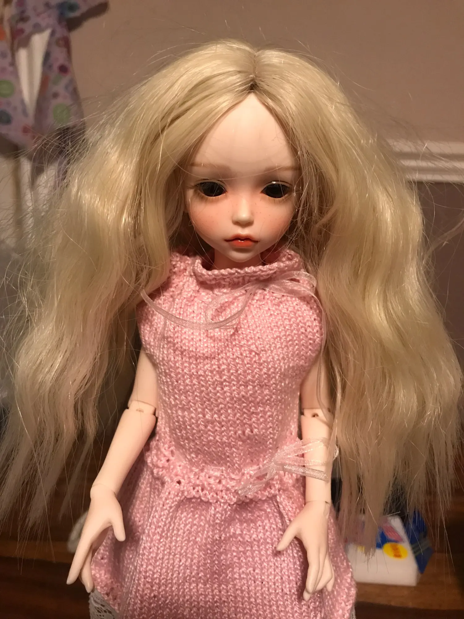 Цвет 18, Minifee Eclair, размер головы 17. Имеет 2 тона розового, не похожего на фото продавца. Мне нужен бледно-розовый цвет.