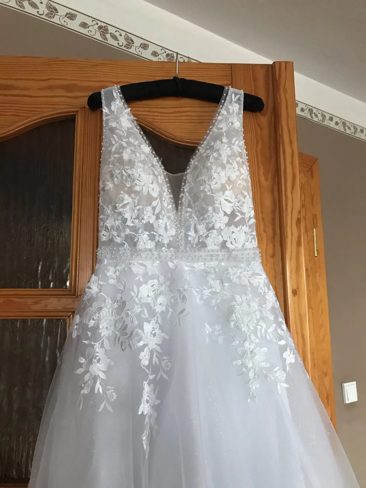 Красивое платье! Стоит своих денег. Продавец взял мои размеры. Село отлично. Платье с шлейфом. Верхняя юбка блестит. Пришло быстро.
