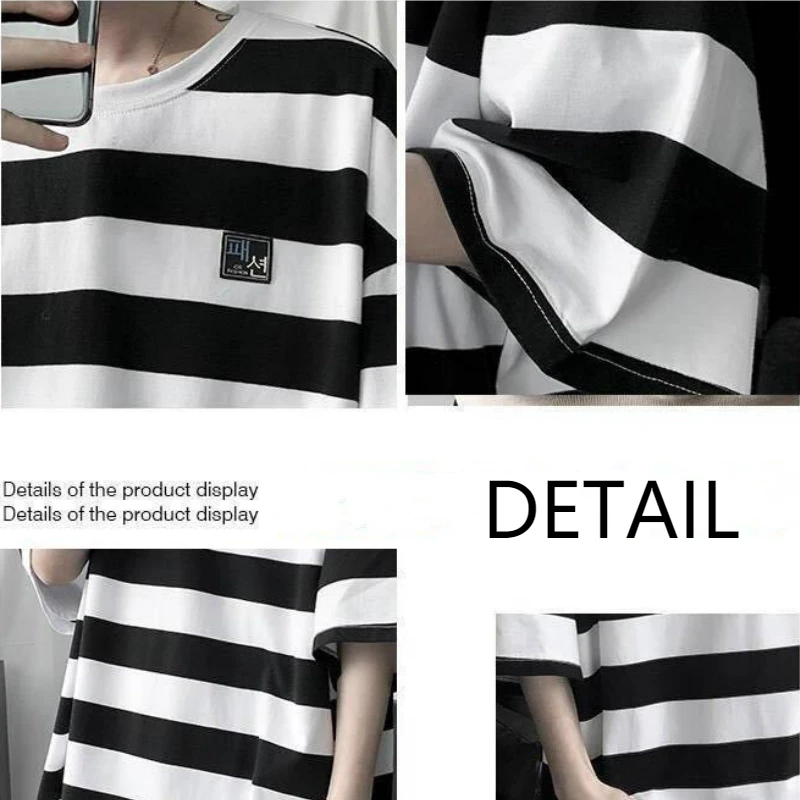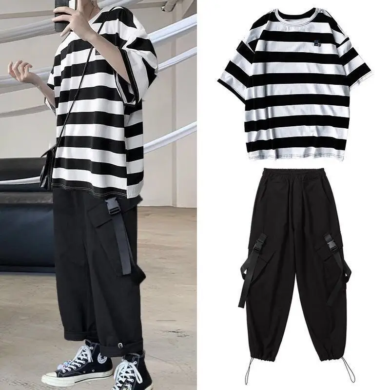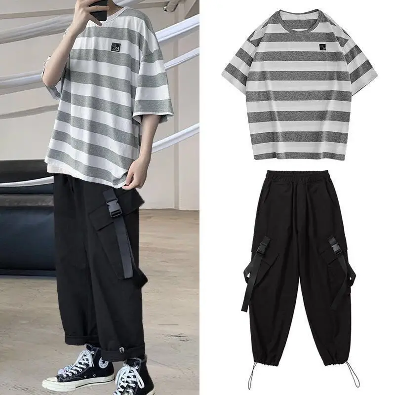 Мужской комплект в полоску, брюки до щиколотки, лето размера плюс, 3XL, шикарный, для отдыха в Корейском стиле хип-хоп, свободные, в стиле сафари, для подростков