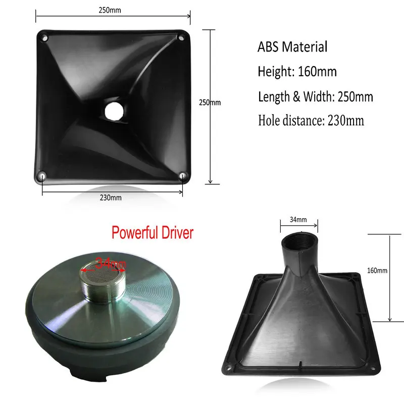 Мощный рупорный динамик Высокочастотный динамик Диафрагма: смола Сопротивление: 8Ω Магнит: 17 унций S. P. L. : 108 дБ/Вт/м Диапазон воспроизводимых частот: 3K-22 кГц Размер рога: примерно. 250 × 250 мм Размер отверстия до отверстия: как на изображении Φ34,5 мм KSV звуковая катушка Материал клаксона: ABS Максимальная мощность 3000 Вт... Создайте потрясающую и качающую музыку... Рожки супер качества. Звуки распространяются очень далеко на 100 метров. Посылка: 1 шт. * рупорный динамик (включить драйвер)