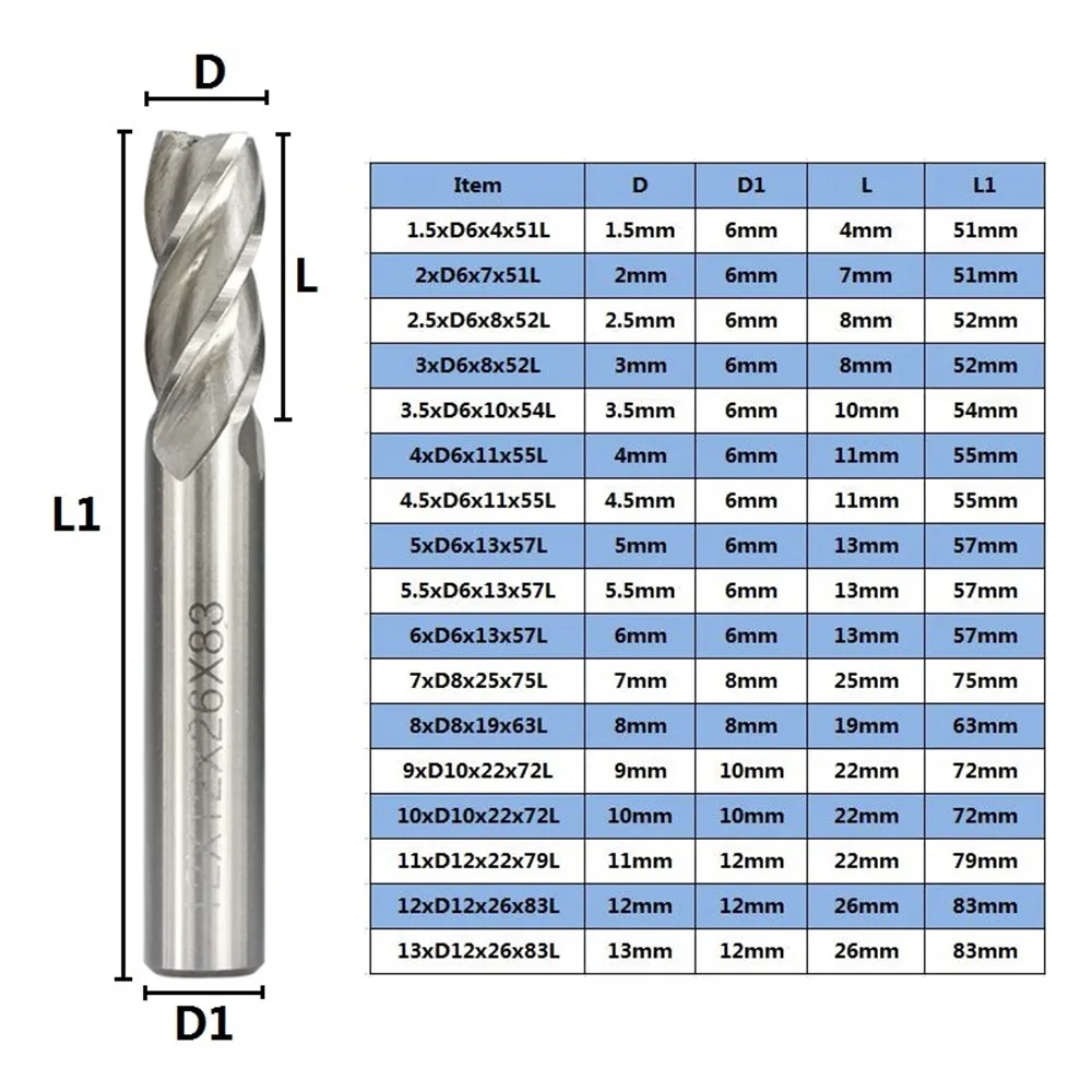 Концевая фреза из быстрорежущей стали с 4 канавками, диаметр 1,5-13 мм, 1 шт.