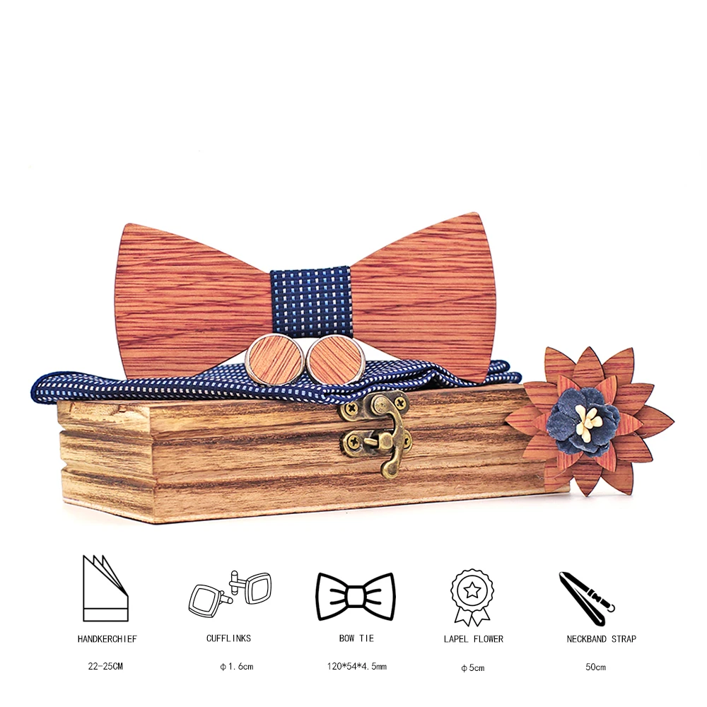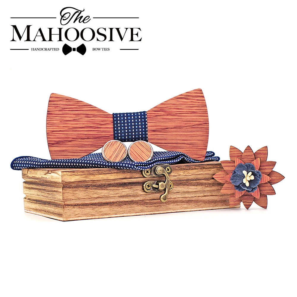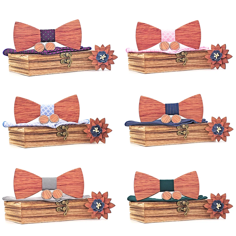 Регулируемый деревянный галстук-бабочка Bingtangor для мужчин, нагрудные Квадратные запонки, брошь и деревянная коробка, для свадебного костюма