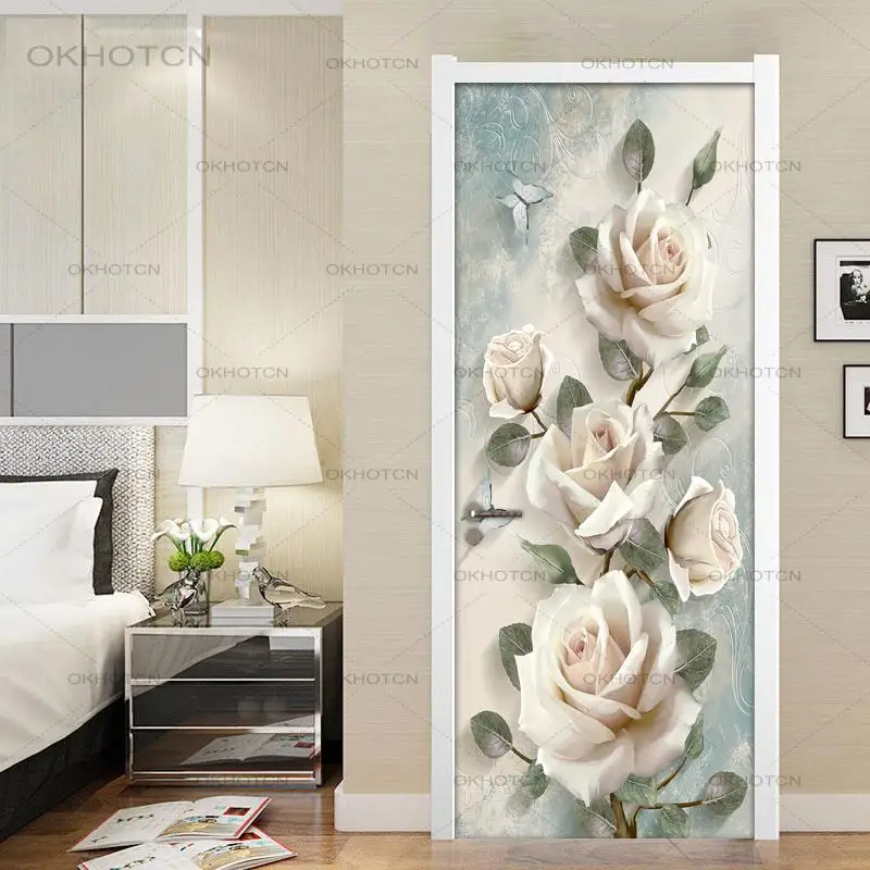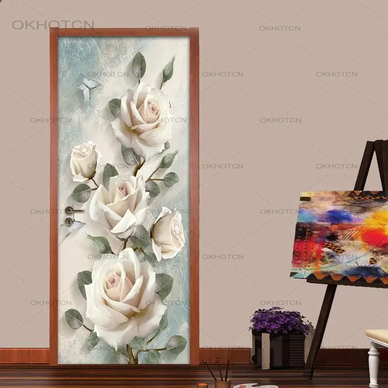 Скандинавская 3D наклейка на дверь с цветами, домашний декор, настенные наклейки сделай сам, самоклеящиеся дверные обои из ПВХ, водонепроницаемая роспись, украшение для спальни