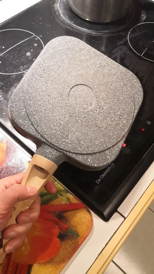 Немного маленький, но в целом отличный, чтобы сделать омлет .. Материал на самом деле имеет тяжелое качество, и рукоятка также очень прочна. Всего несколько см выше и шире, и это было бы идеально, но это нормально по цене.