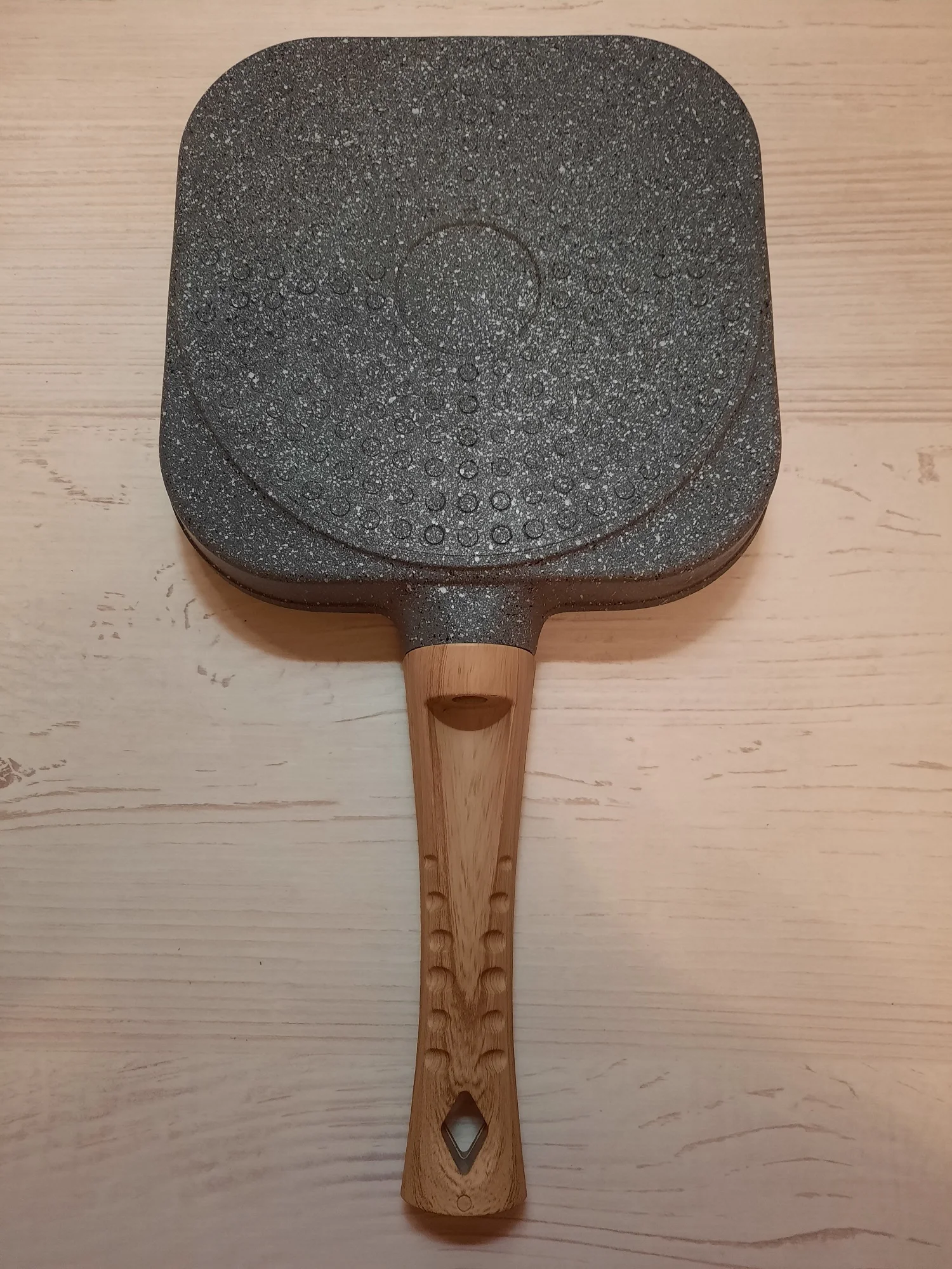 Отличная сковорода. Ручка пластиковая, нескользкая, под дерево.Немного меньше по размеру, чем ожидалось. Бортики высокие. Доставка быстрая, отправляли правда долго. Упаковано хорошо-коробка и пленка дутая. Осталось подобрать лопаточку для переворачивания.