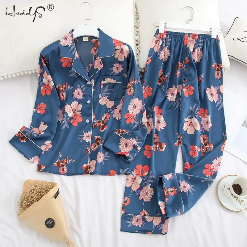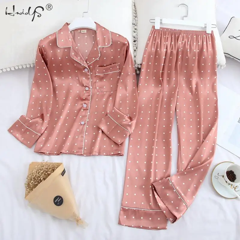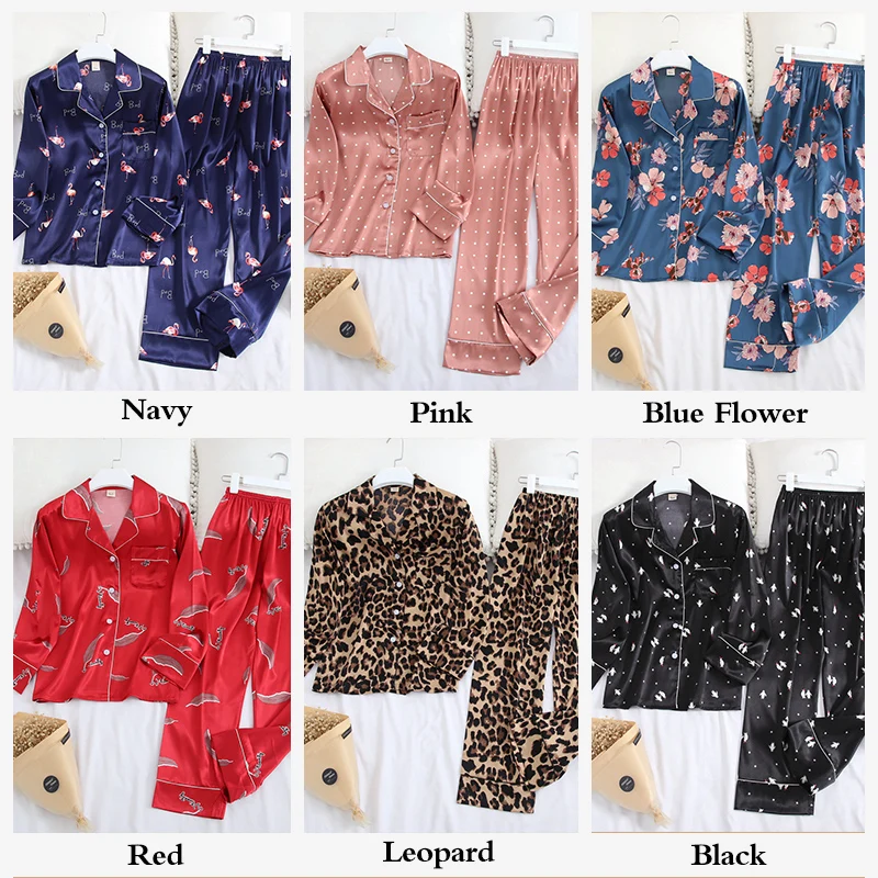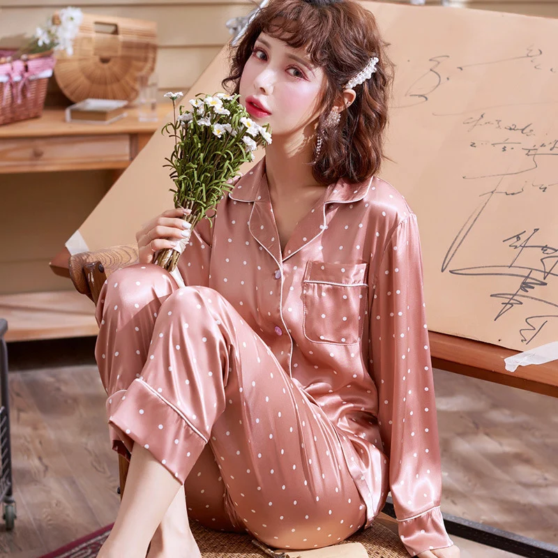 Пижама женская атласная с отложным воротником, Шелковый пижамный комплект с длинным рукавом, одежда для сна, ночная рубашка