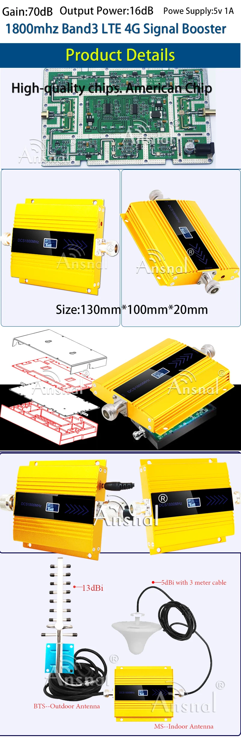 -Модель: DCS LTE 4G1800MHZ.-Цвет: Золотой-Усиление: вверх 65 ± 3 дБ; Вниз 70 ± 3 дБ-4G/DCS LTE 1800Mhz (Band3) Частотный диапазон: (загрузка 1710mh ~ 1785mhz, загрузка 1805mhz ~ 1880mhz)-Сопротивление: 50 Ом-Уединение: >70 дБ-Максимальная выходная мощность: + 20 дБм-Тип разъема: Гнездо F-Рабочая температура: -10 ~ 55 градусов-Питание: 110/220 В переменного тока; 5,5 В постоянного тока, 1 А-Размер ретранслятора: 110*75*20 мм-Вес повторителя: 0,45 кг----------------- Улучшите сигнал вашего мобильного телефона. Больше никакого плохого приема. Больше никаких звонков.-Расширьте покрытие сигнала там, где сигнал слабый. Подходит для использования дома и офиса.-Простота установки своими руками. Вам просто нужно подключить провода, которые у вас есть.-Каждая внутренняя антенна может покрывать около 500 квадратных метров (открытое пространство). На каждый ретранслятор можно установить до 3 комнатных антенн.-Поддержка голоса всех мобильных операторов + Sms + данные -------------------------