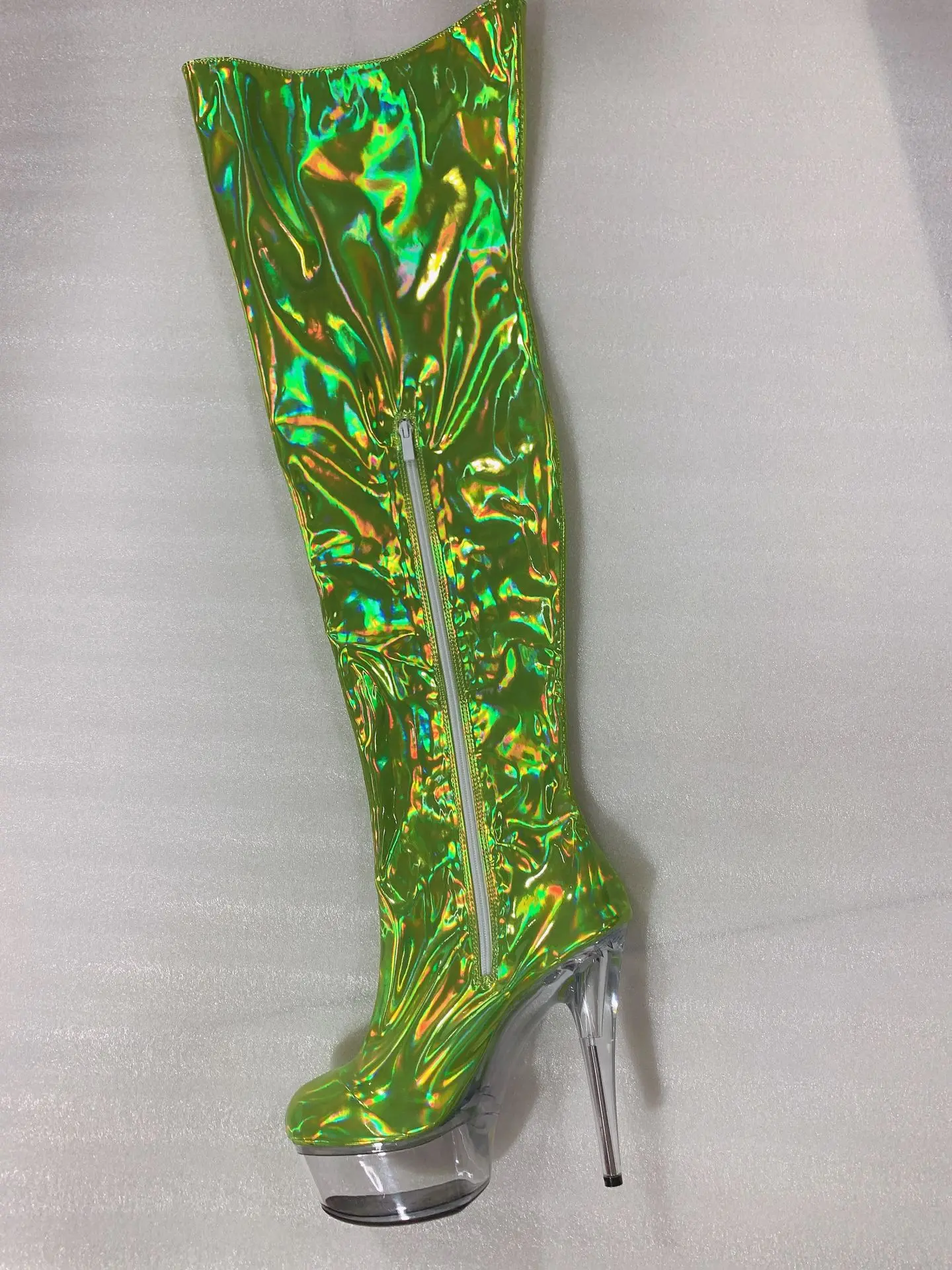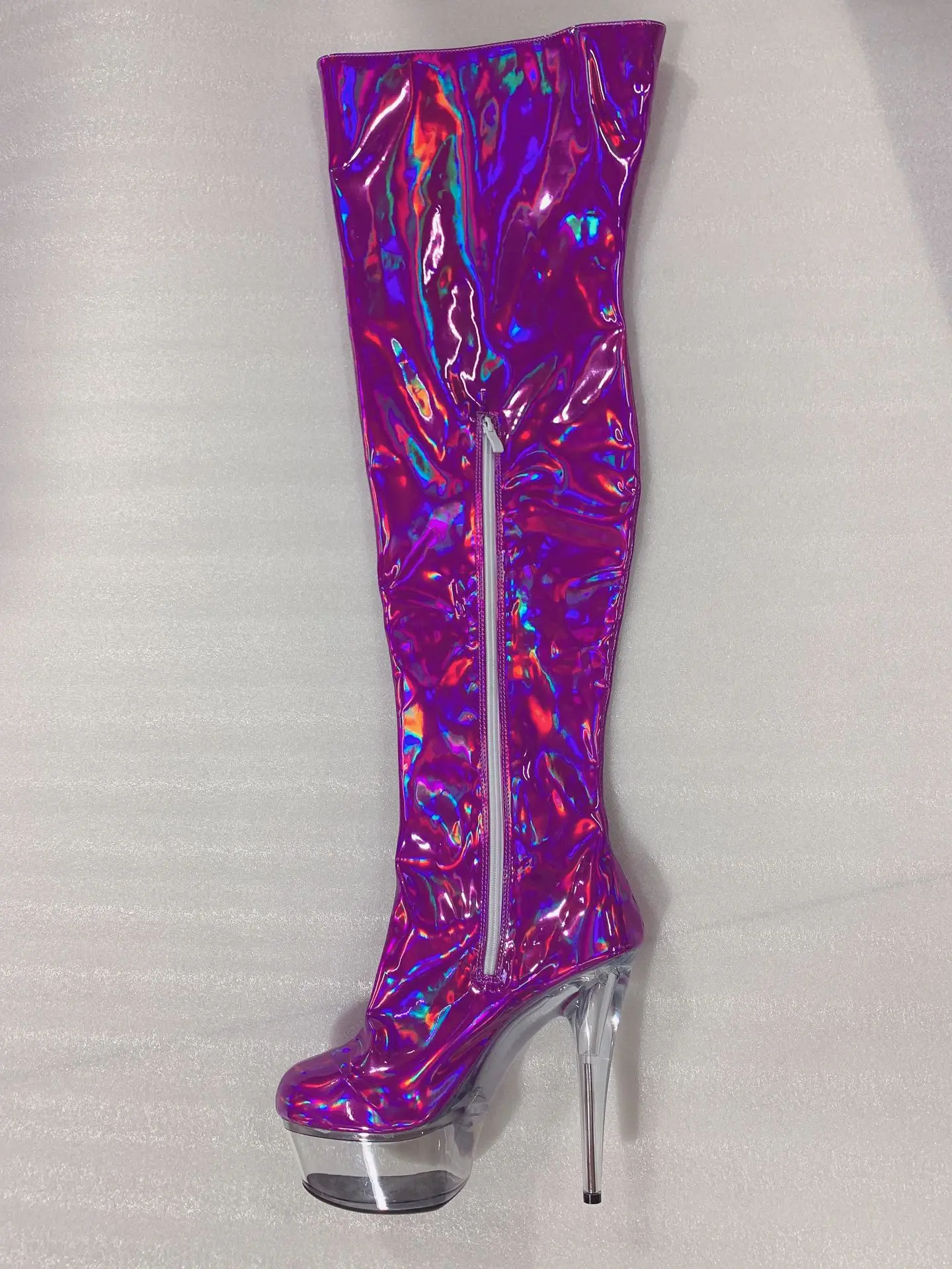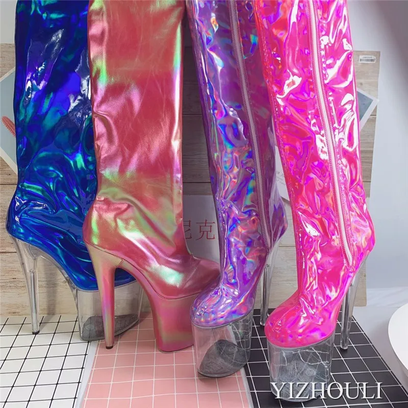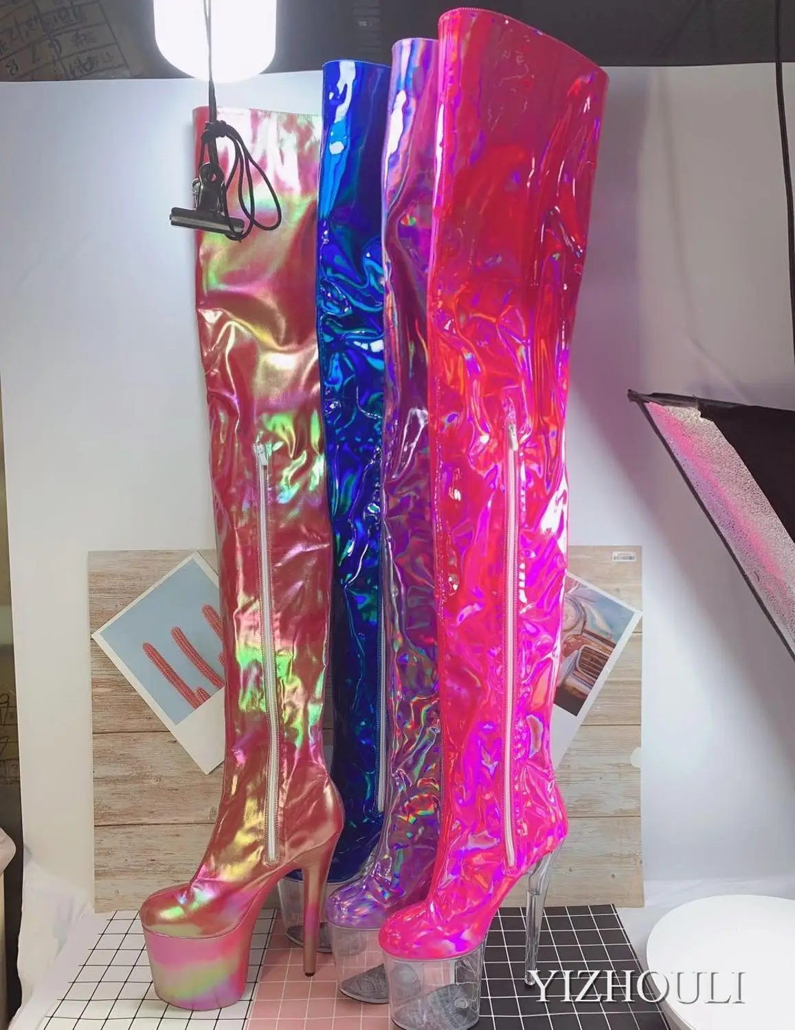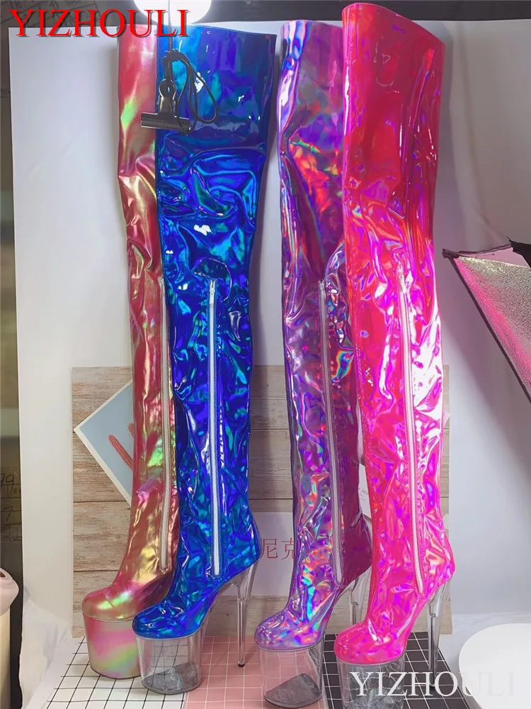 Сапоги выше колена 15-17-20 см из материалов, меняющих цвет, модные пикантные сапоги до бедра на молнии для танцев