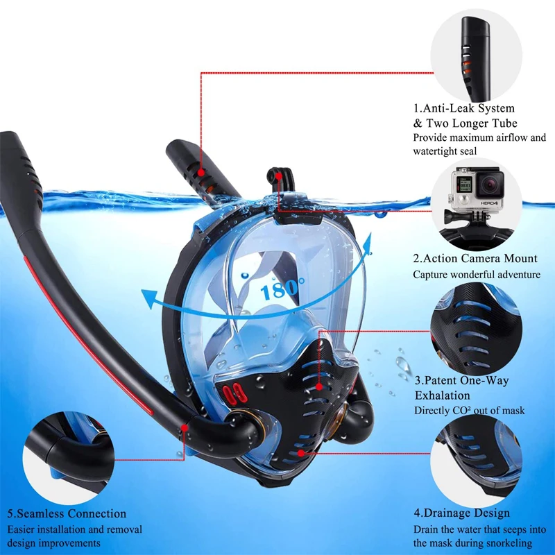 [Самая безопасная запатентованная 2020 система дыхания] Эта Современная маска для подводного плавания на все лицо имеет запатентованную дыхательную систему с двойными дыхательными трубками, которая механически отделяет истечение срока годности от вдохновения. Вдохновение проходит через двойную дыхательную трубку. Отдельная дыхательная камера эффективно предотвращает накопление CO2, что гарантирует, что через маску подводного плавания всегда циркулирует свежий воздух.