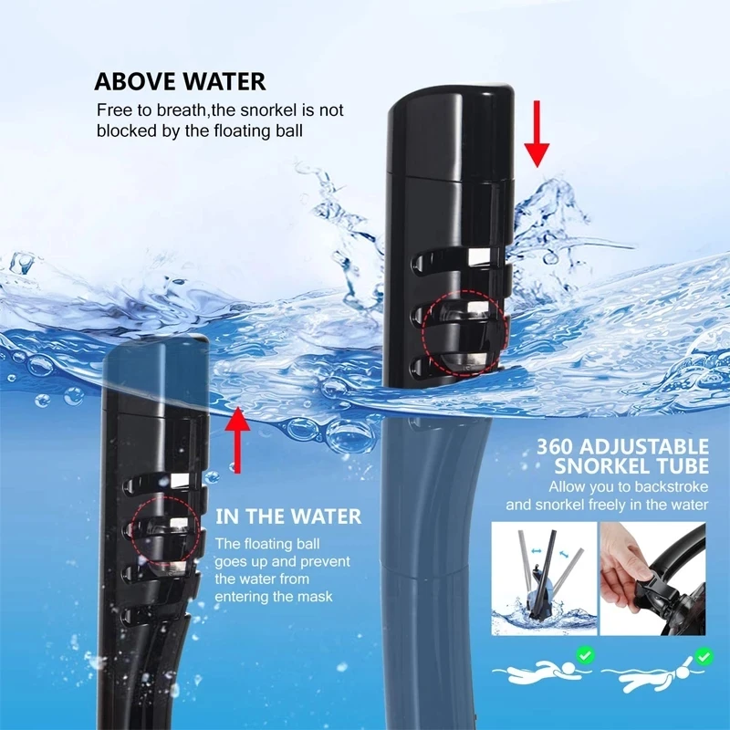 [Медицинский оригинальный материал и технология защиты от протечек] маска для подводного плавания на все лицо изготовлена из высококачественного поликарбоната и медицинского силикона. Нетоксичный и экологичный, что может предотвратить кожу, вызывающую аллергию или другие проблемы с кожей, вызванные оригинальными материалами. Мягкая силиконовая подкладка для маски предотвращает идеально протекание морской воды и плотно прилегает к лицу, два плавающих шарика закрывают верхнюю часть подводного плавания при погружении в воду, что может предотвратить попадание соленой воды в дыхательную трубку.