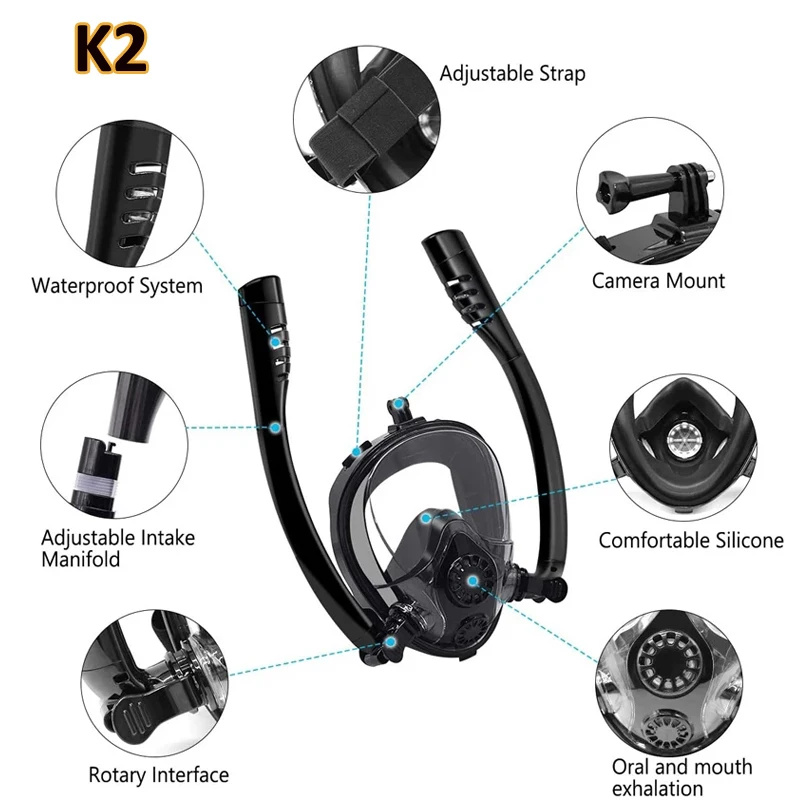 [Разница между масками для дайвинга K2 и K3] в обеих масках для дайвинга используется [медицинские оригинальные материалы и технология защиты от протечек] маска для подводного плавания на все лицо изготовлена из высококачественного поликарбоната и медицинского класса силикон. Маска для дайвинга K3-последняя модель в этом году. По сравнению с маской для дайвинга K2, маска для дайвинга K3 имеет более длинную съемную трубку, которая легче по весу. Тем не менее, трубка маски K3 надежно соединена с основным корпусом маски для дайвинга, регулировка вращения невозможна. Дыхательная трубка маски для дайвинга K2 и основной корпус маски для дайвинга можно вращать.