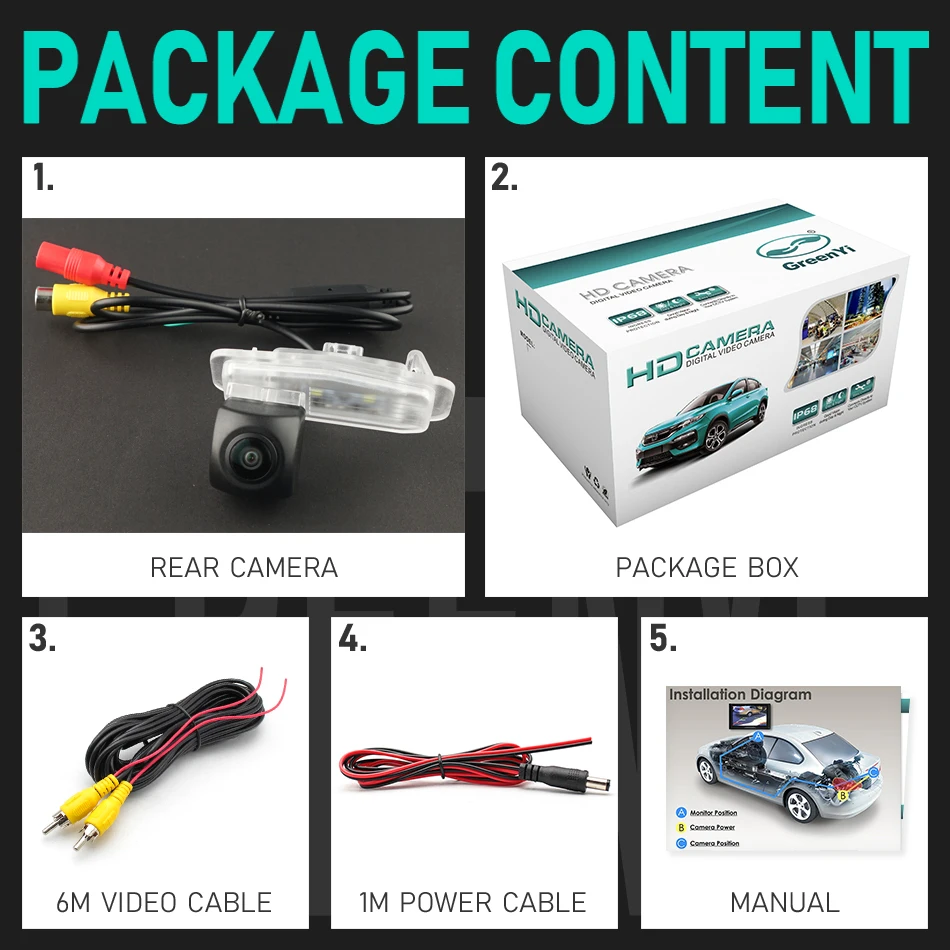 1. CVBS/AHD камера заднего вида2. Коробка для посылка3. Видео кабель 6 м4. Кабель питания5. Руководство пользователя