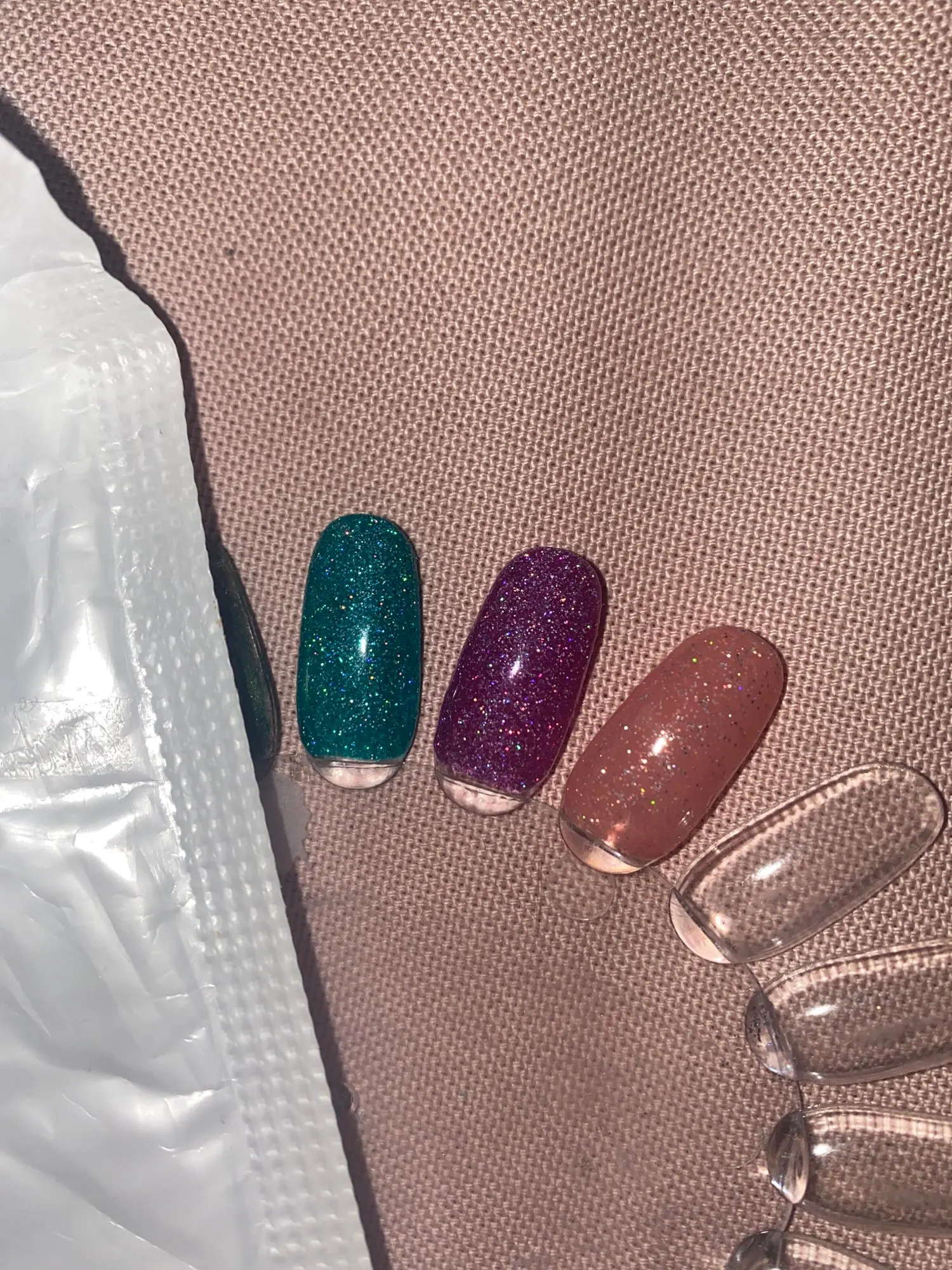 Доставка 26 дней в отделение Укрпочты. Если нанести в 1 слой - выглядит как прозрачный лак с блёстками. В 2 слоя - уже есть намёк на серый, но всё равно прозрачный. В 3 слоя - (на прозрачной типсе на фото видно) вроде серый, но всё ещё не перекрывает цвет. Чем больше слоёв, тем заметнее серый и менее красиво смотрятся блёстки. Так что вывод такой: сначала нужно нанести цветной лак, а на него уже 1 слой этого лака, только тогда будет как на фото у продавца.
