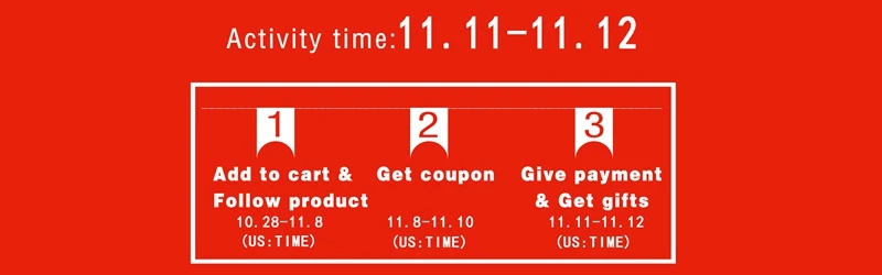 ВРЕМЯ СОБЫТИЯ: 11-12 ноября, тихоокеанское время1. С 28 октября по 10 ноября заранее добавляйте Любимые товары в корзину2. Станьте нашими поклонниками. Подпишитесь на магазин, чтобы получить дополнительные скидки (в то же время вы можете получить Скидочные купоны магазина)3. Время оплаты с 11 по 12 ноября (не пропустите)4. Мы дарим бесплатные подарки первым 500 покупателям, которые приобрели