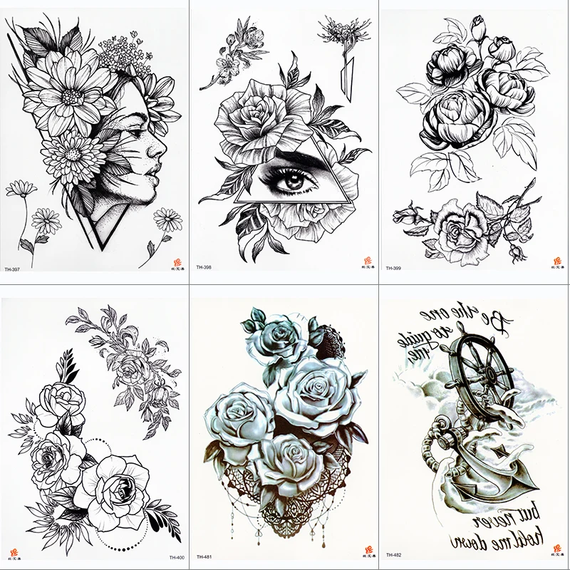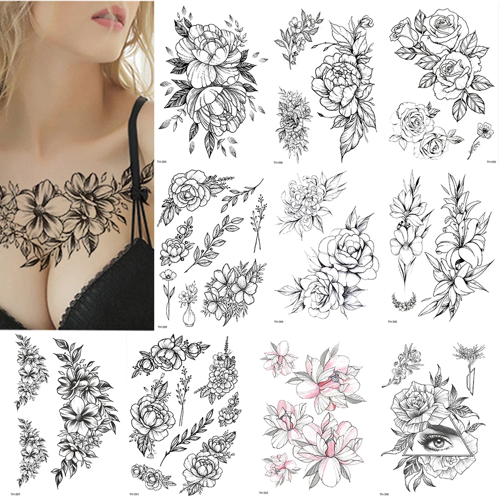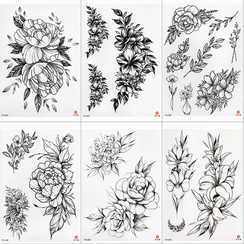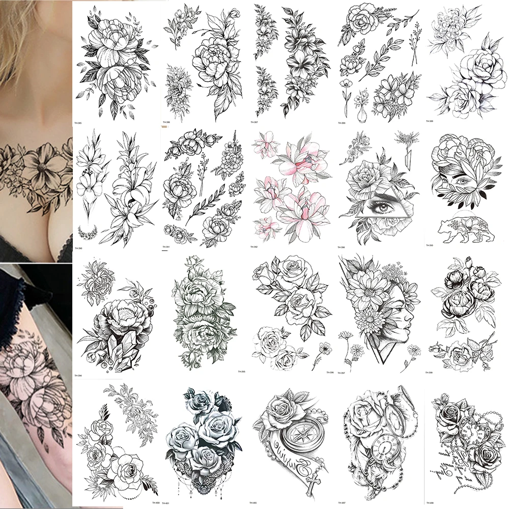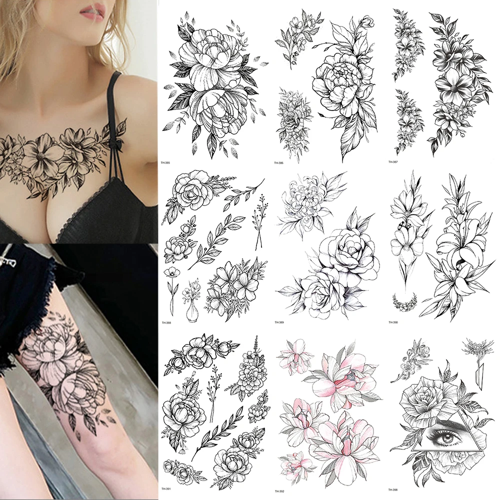 1020 шт. розовый цветок пиона для девочек Временные татуировки для женщин Водонепроницаемый черный наклейки для временных татуировок цветов леди сумки на плечо DIY татуировки