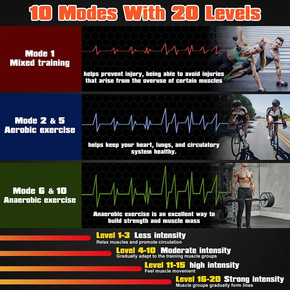 Различные режимы с 20 уровнями Режим 1: смешанные тренировки Режим 2 ~ 5: аэробные упражнения Режим 6 ~ 10: Анаэробные упражнения Эффективность нашего стимулятора Abs 20 минут в день ~ 2000 м бега 20 минут в день ~ 30 минут плавания 20 минут в день ~ 20 минут абдоминальной кампании