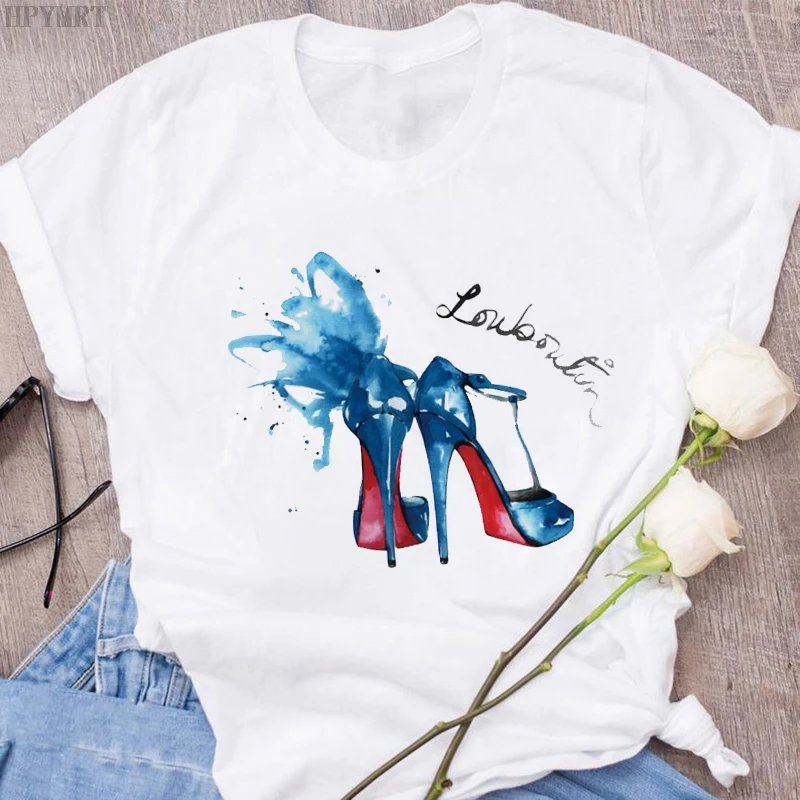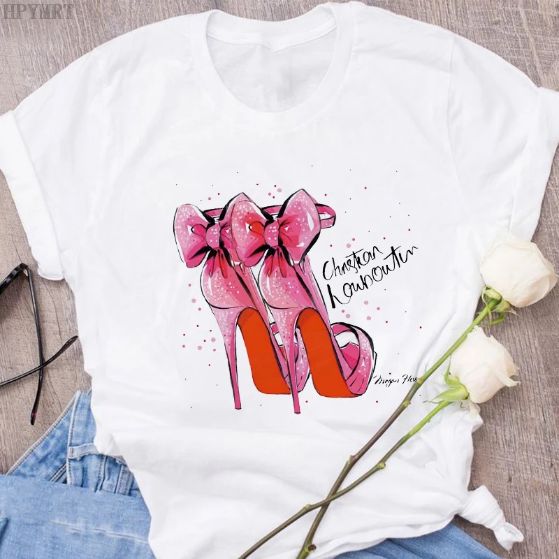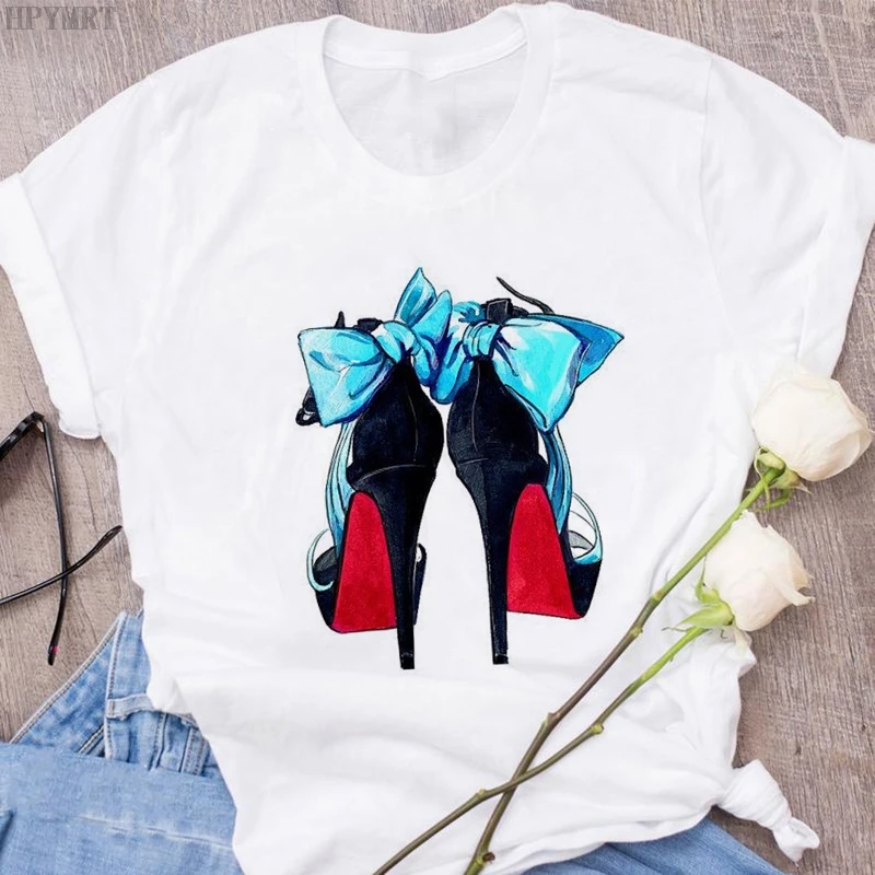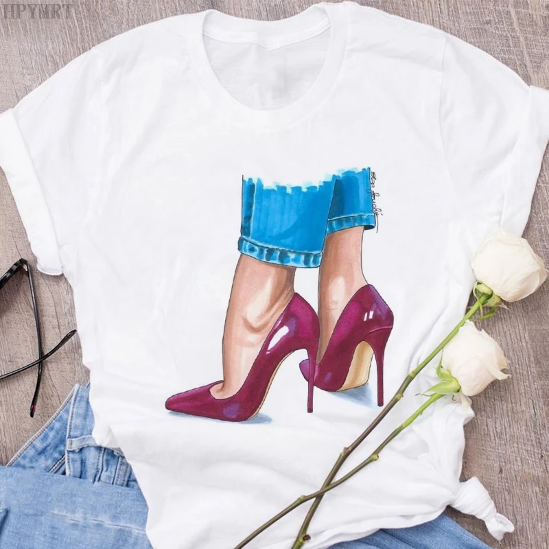 Женская футболка в стиле Харадзюку; Пикантная летняя футболка на высоком каблуке с принтом и короткими рукавами; Модные топы; Повседневная женская футболка большого размера; Одежда