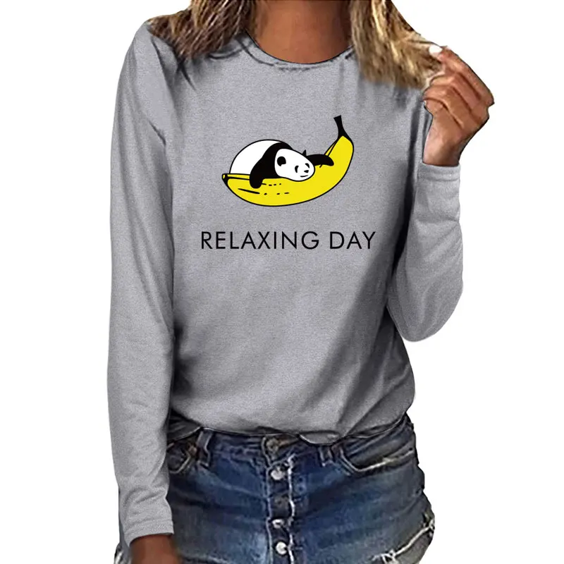 Женская футболка с принтом панды, банана, длинным рукавом и круглым вырезом