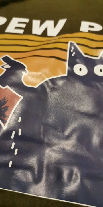 Посылка пришла за месяц, упакована хорошо. Сшита качественно, ткань хлопок с полиэстером, на ощупь приятная, тонкая. Но думаю со временем появятся катышки. Пока после 2х стирок все нормально. Наклейка не трескается, не линяет. Цвет как на фото.