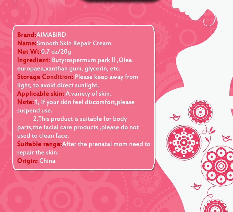 Предназначен для пренатальной и послеродовой кожи матери, содержит эссенцию различных растений и питательные восстанавливающие ингредиенты, мягкая и тонкая текстура, для легкого впитывания кожей, увлажнения кожи, разглаживания кожи, устраняет дряблость и огрубевшие проблемы с кожей, такие как появление тонких линий, делает кожу сияющей упругой, восстанавливает нежную гладкость кожи.