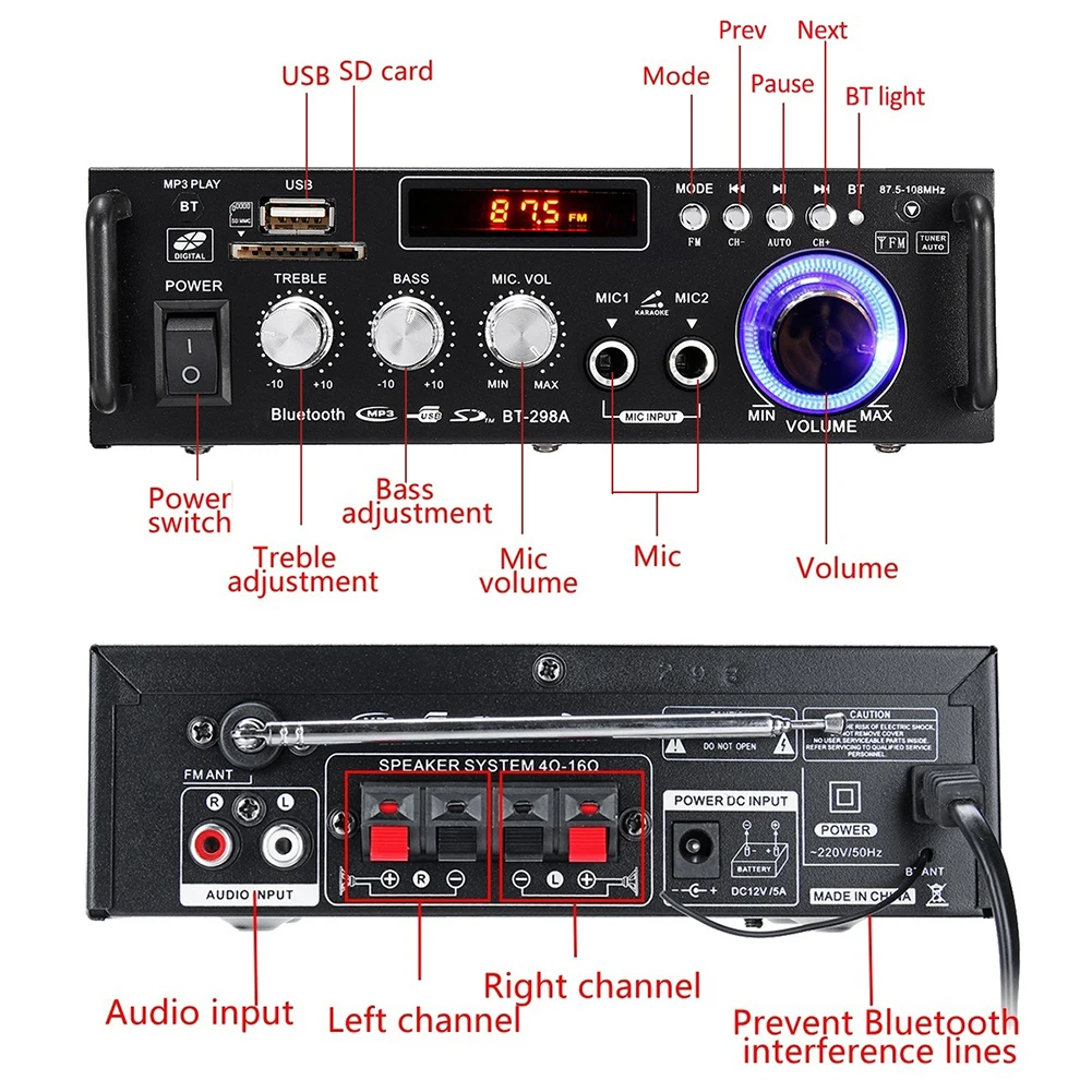 Особенности:-Два выхода основного канала.-С функцией дистанционного управления.-Поддерживает fm-стерео радио.-Питание постоянного/переменного тока, подходит для дома или вашего автомобиля.-Мини HIFI Цифровой Bluetooth аудио усилитель мощности.-Встроенный ЖК-дисплей с функцией подсветки.-Два разъема для микрофона, система караоке в вашем доме или в автомобиле.-С высокими частотами, басами и регулятором громкости, очень прост в использовании.-Низкое Искажение обеспечивает более четкий, сильный и мощный звук.-Sd-карта, u-диск, воспроизведение формата MP3, Поддержка беспроводного подключения Bluetooth.Характеристики:Входное напряжение: AC 220V/ DC12V (в автомобиле)Bluetooth: поддержкаВыходная мощность: 80 Вт + 80 ВтПиковая мощность: 300 Вт + 300 ВтКанал: 2CHСопротивление нагрузки: 4-16ΩSNR: >92 дБFM частота: 87,5-108 МГцКоэффициент искажений: 0.05%Частота: 10 Гц-20 кГцЧувствительность: 0,25 МВ-220 МВRC Источник питания: аккумулятор CR2052 (встроенный)Размер: прибл. 18x15.5x5.5 см/7.08x6.10x2.17''Посылка включает в себя:1 х аудио усилитель1 пульт дистанционного управленияПримечания:1. Измерения выполнены вручную, допускается погрешность в 1-3 мм, спасибо.2. Из-за разницы между различными мониторами изображение может не отражать фактический цвет изделия. Мы гарантируем, что стиль такой же, как на картинке.