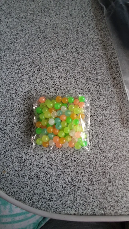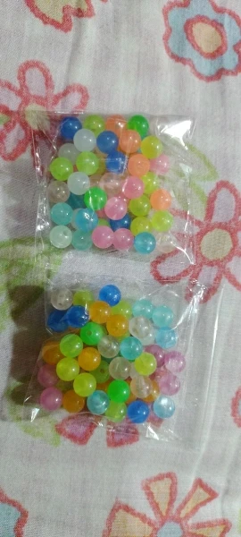 Доставка до Самары 27 дней, описанию соответствуют, на вид в пакете шт 100, не пересчитывал, светятся только если были под прямыми солнечными лучами, свет ламп или пасмурная погода эффекта не даёт, и не понятно зачем в наборе бусины красного цвета, они вообще не светятся, и нужен долгий накопительный эффект 30 мин на солнце это пара минут свечения.