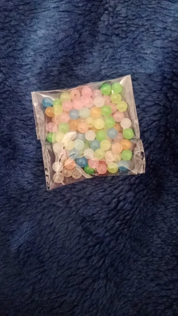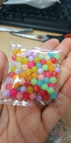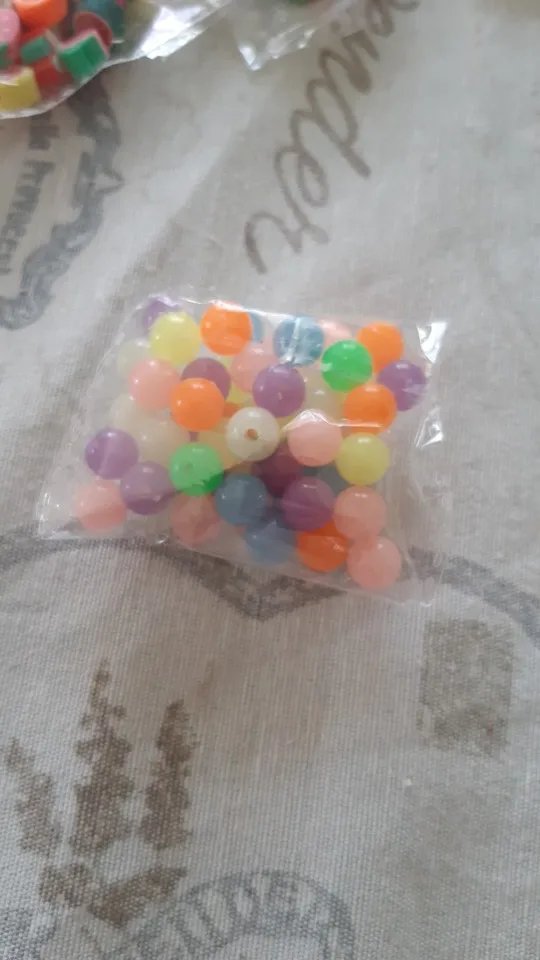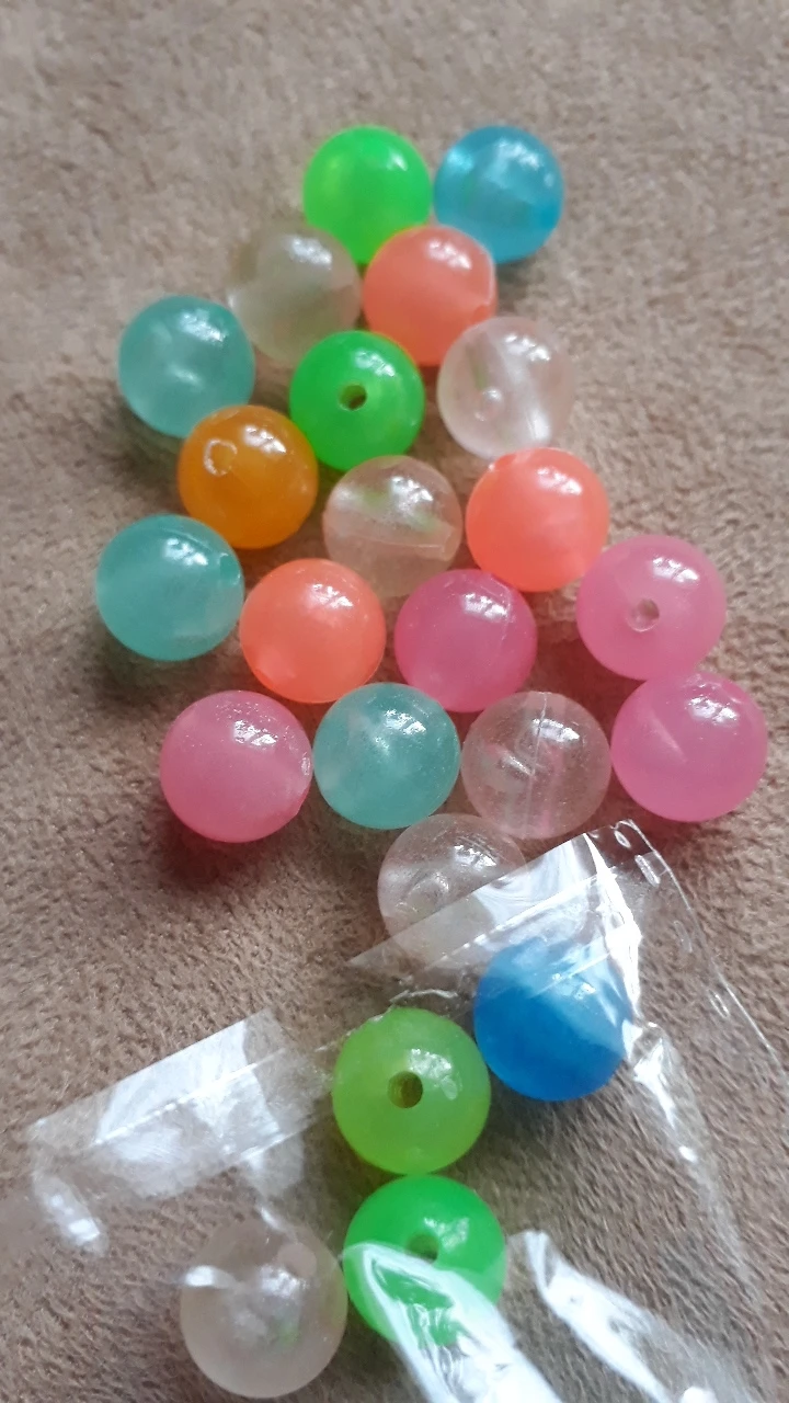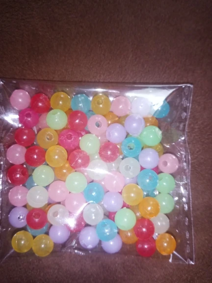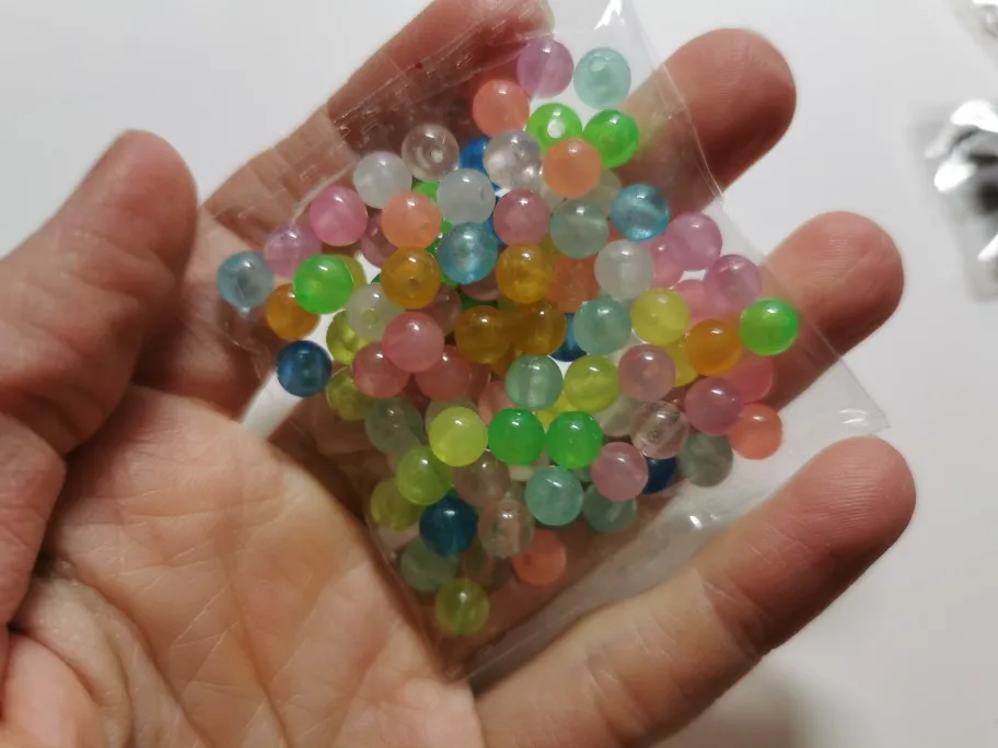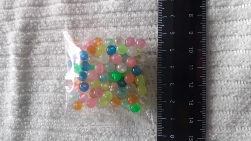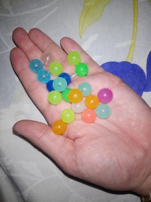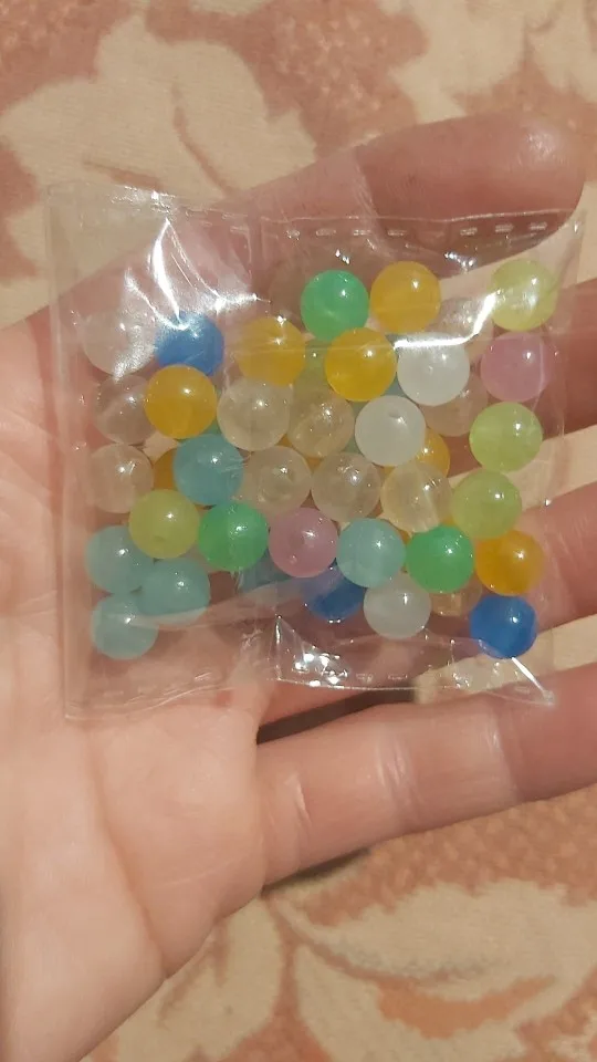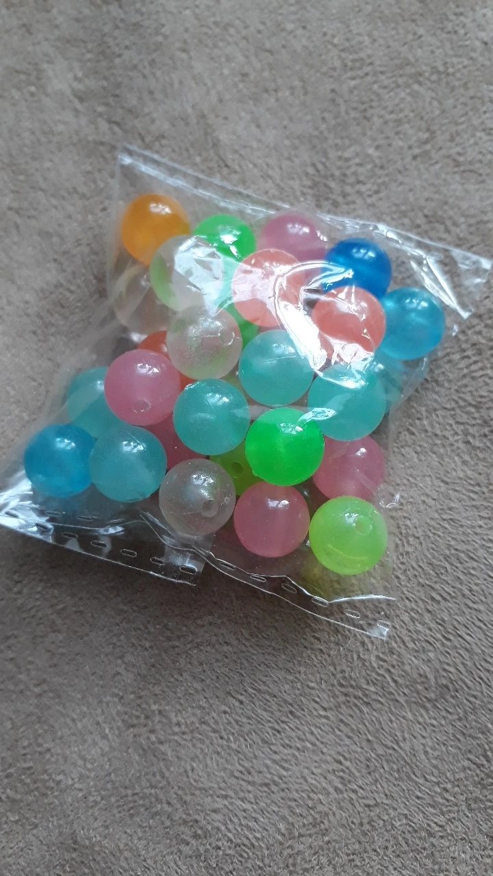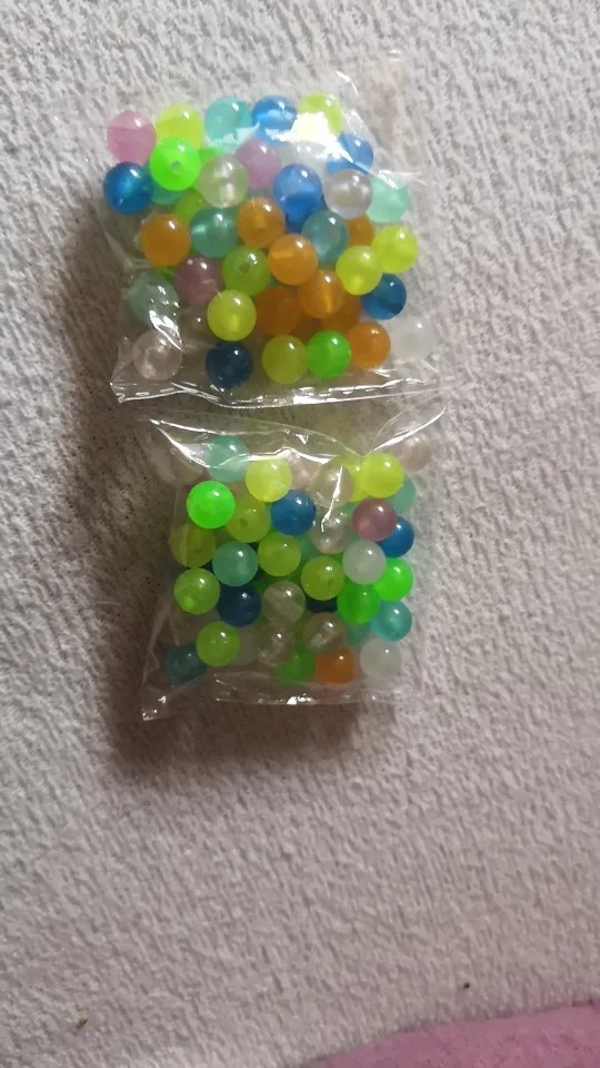 Как на фото. Некоторые цвета выглядят больше, чем другие, как зеленые, но в сумке не так много, и, поскольку все фосфоресцирует, это не длится долго. Я взял размер 6 мм, они действительно маленькие, но, как я хотел их. Я сделал браслет с жемчугом.