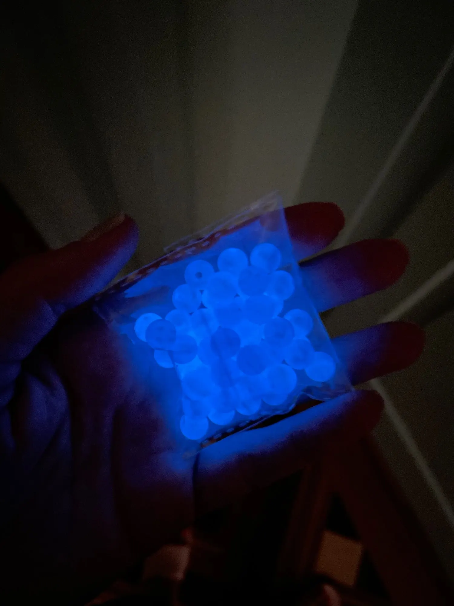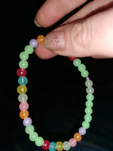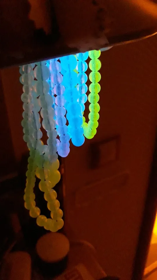 Отличные бусы! Это как мой 3-й заказ от 6 до 12 разных цветов каждый раз, в разных размерах и будет больше после этого заказа. Они становятся действительно яркими после того, как вы зарядите их при хорошем освещении в течение нескольких минут. Также многие из них переходят к совершенно другому цвету в темноте. Как розовый, белый или синий, розовый. Потрясающие бусы! Я определенно рекомендую это во всем остальном...