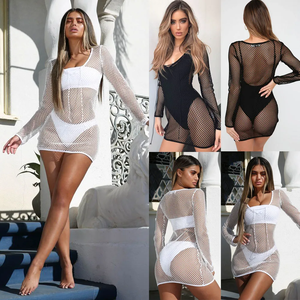 Пляжная накидка Женская, пикантная сетчатая длинная прозрачная блуз...