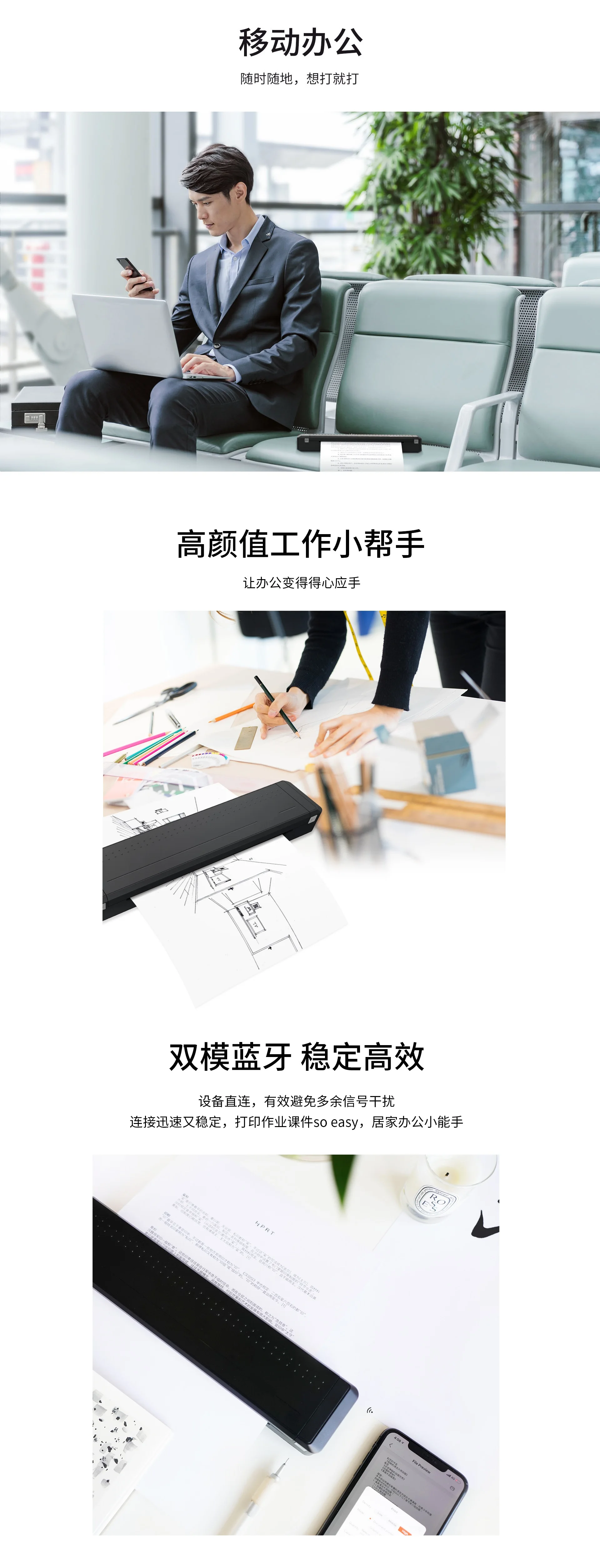 • Компактный и легкий, высокая мобильность • Высокое разрешение 300 точек/дюйм • Соединение Bluetooth 4,0 • Прямая зарядка USB Type-C • Аккумулятор большой емкости и долгий режим ожидания • Автоматическое всасывание бумаги • Гуманизированный дизайн, легко менять расходные материалы • Специальное бесплатное приложение • Поддержка Android/iOS/Windows